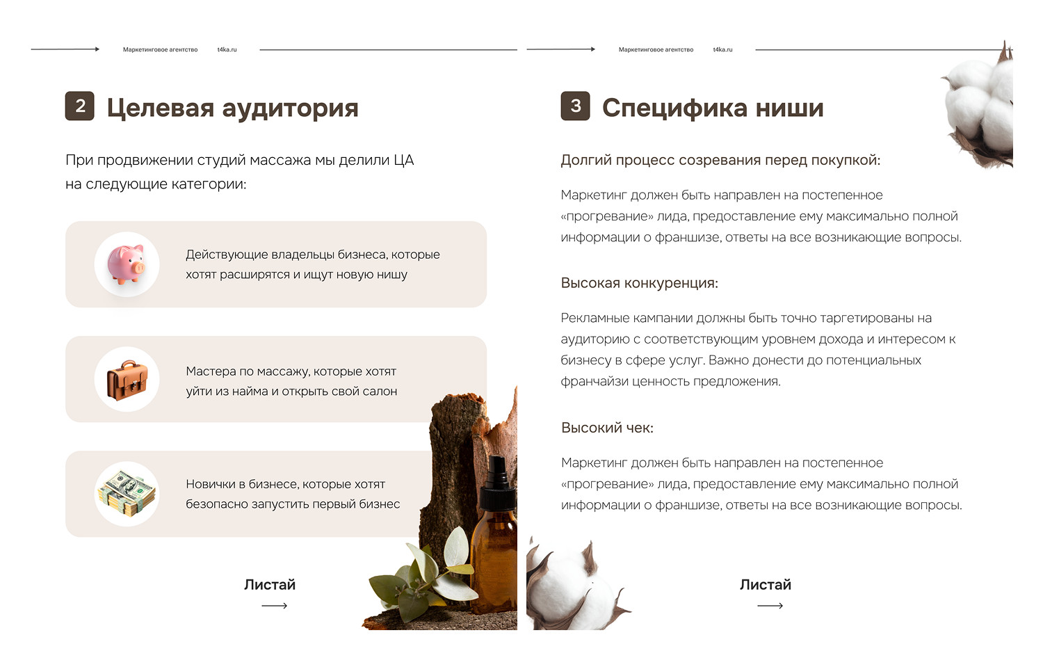 Для эффективной рекламы важно точно понимать, кто ваша целевая аудитория. Чтобы найти предпринимателей, заинтересованных в покупке франшизы массажной студии, мы используем следующую стратегию: