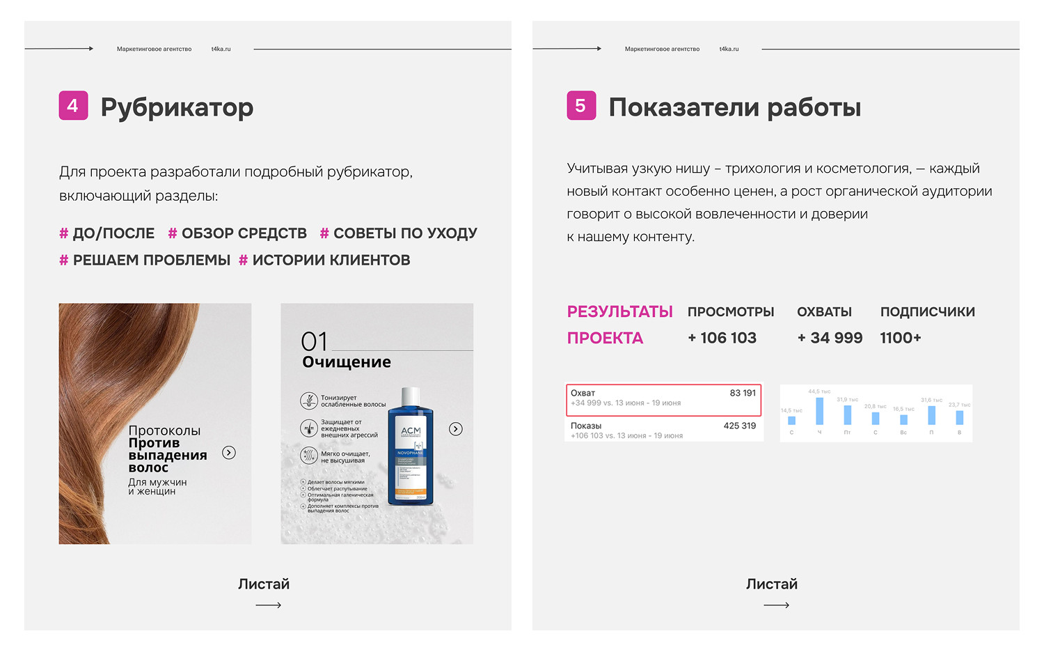 Наглядные изменения кожи после применения средств. Включает фотофиксацию, описание протокола ухода и экспертную оценку полученных результатов. #2 ОБЗОР СРЕДСТВ Подробный разбор состава, текстуры, механизма действия и ожидаемых эффектов косметических продуктов, включая возможные противопоказания. #3 РЕШАЕМ ПРОБЛЕМЫ Анализ распространенных кожных заболеваний — от акне до признаков старения. Показано, как косметика может корректировать эти проблемы на физиологическом уровне. #4 ИСТОРИИ КЛИЕНТОВ Отзывы реальных людей с описанием их пути от проблемы к результату. Не заменяет консультацию врача, но помогает лучше понять действие средства. #5 СОВЕТЫ ПО УХОДУ Практические рекомендации по организации ухода за кожей, сезонным особенностям и правильному использованию активных компонентов. Благодаря качественному контенту и активному взаимодействию с аудиторией удалось привлечь более 1 100 новых подписчиков, не используя таргетированную рекламу. Учитывая узкую нишу — трихология и косметология, — каждый новый контакт особенно ценен, а рост органической аудитории говорит о высокой вовлеченности и доверии к нашему контенту.Увеличилось число лайков, комментариев, репостов. Особого внимания заслуживает возросшая частота упоминаний продукции в сторис, свидетельствующая о повышении лояльности и готовности к рекомендации. подписчики 1100+ охваты +34999 просмотры +106103 Хотите, чтобы ваш бренд вызывал доверие и привлекал качественную аудиторию? Посетите наш сайт и оставьте заявку. Команда «В точку» разработает индивидуальную SMM-стратегию, которая обеспечит реальный рост вашему бизнесу.