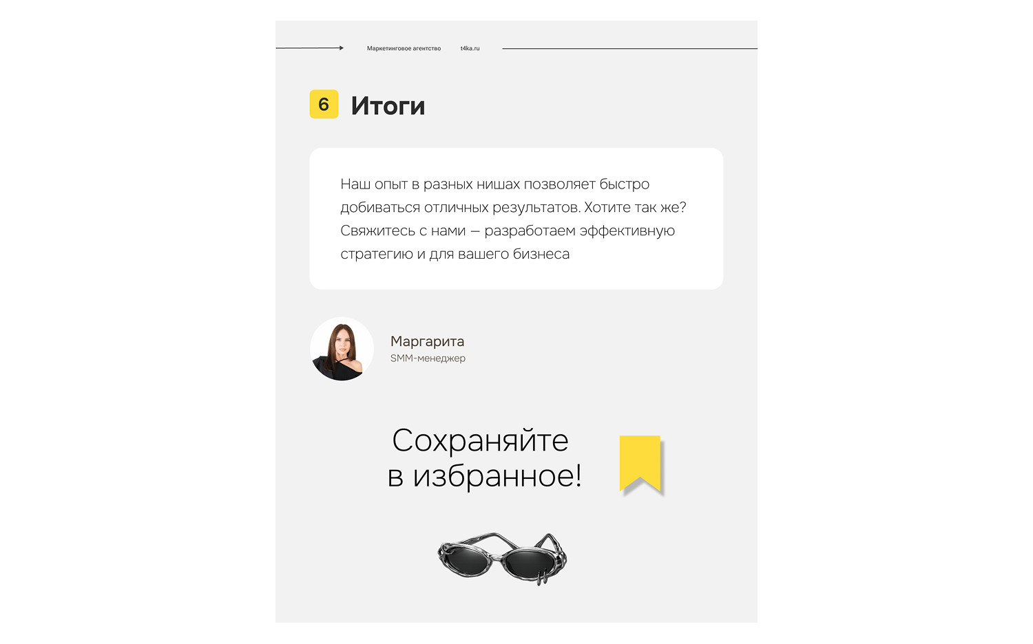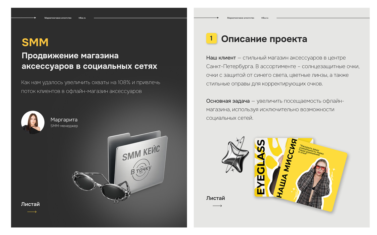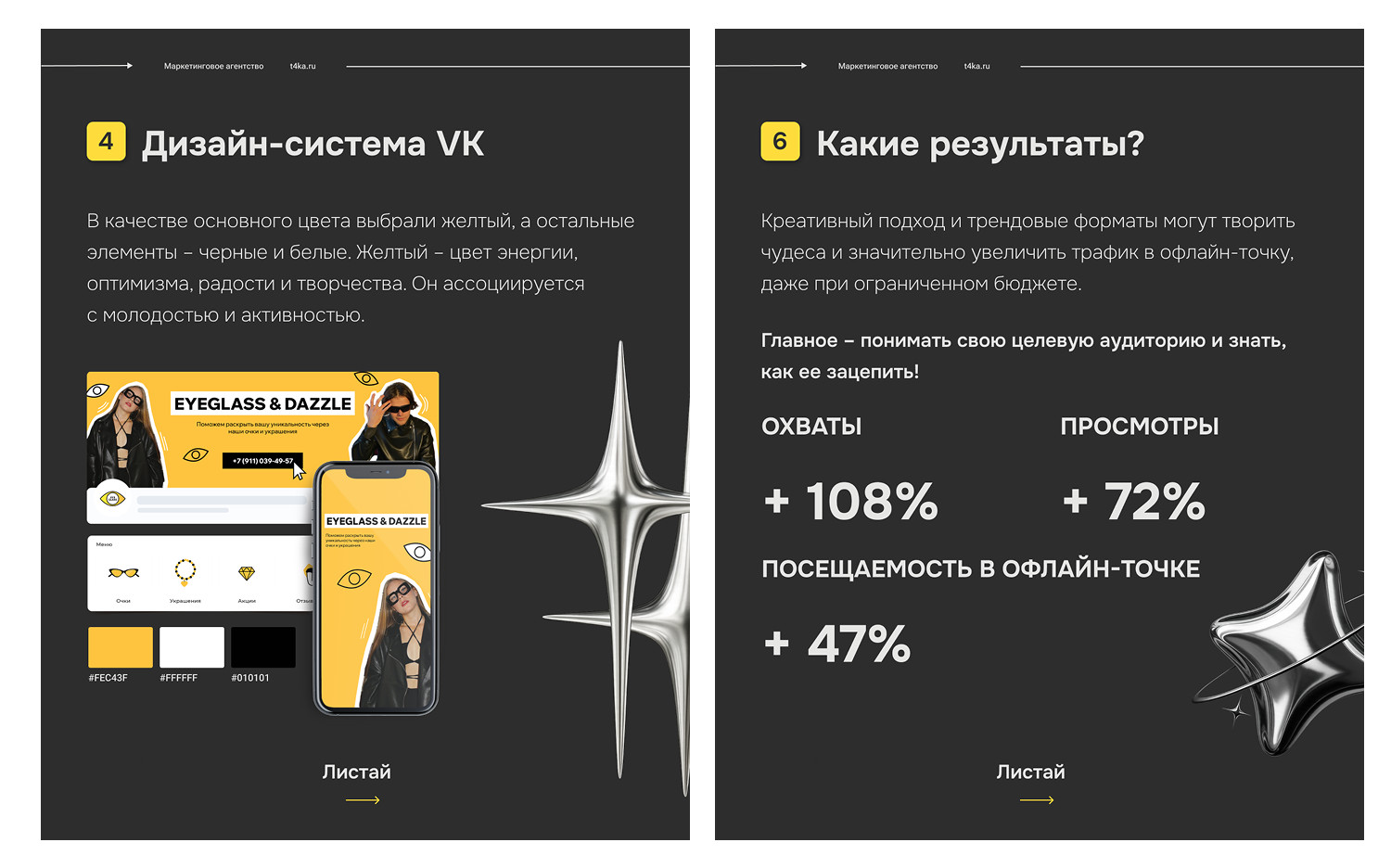 2. Играем со словами, экспериментируем с форматами и удивляем аудиторию. 3. Мы не боимся шутить и иронизировать, ведь «улыбка» — лучший способ расположить к себе. 4. Знаем все об аксессуарах и очках и щедро делимся своими знаниями с аудиторией, помогая сделать выбор. Мы не просто продаем товар, мы создаем эмоцию. И это, поверьте, гораздо эффективнее. Что скажете? Перед нашей командой стояла задача разработать дизайн-систему для группы ВКонтакте магазина модных молодежных аксессуаров, которая бы эффективно транслировала ключевые ценности бренда. Было важно создать визуальный язык, вызывающий ощущение стиля, современности, динамики и легкой игривости, отражающих дух молодости и актуальных трендов. В качестве основного цвета выбрали желтый, а остальные элементы — черные и белые. Желтый — цвет энергии, оптимизма, радости и творчества. Он ассоциируется с молодостью и активностью. Кроме того, желтый цвет отлично контрастирует с черным и белым, что делает контент более читабельным и акцентирует важные элементы. С проектом ознакомились, целевую аудиторию проанализировали, с tone of voice определились, социальные сети упаковали. Переходим к самой эстетичной и интересной части кейса- создание контента для социальных сетей. Да- да, мы знаем, ниша аксессуаров это простор для креатива и фантазии. Поэтому приводим примеры постов, которые хорошо зашли нашей аудитории: 1) Мы пошли дальше простого анонсирования новинок. Вместо сухого перечисления ассортимента мы создавали вдохновляющие подборки аксессуаров, идеально подходящих к определенным стилям. Например, вот здесь мы рассказывали о том, как подобрать идеальную пару очков для создания неповторимого ретро-образа. 2) А что насчет акций? Как их можно креативно подать? Взять, к примеру, наши интригующие печеньки с предсказаниями. Сама идея предсказаний и загадок возвращает нас в беззаботное детство, пробуждая любопытство и желание узнать, «а что же там?». 3) Выбрать аксессуары онлайн — задача не из лёгких. Часто бывает сложно представить, подойдёт ли та или иная вещь именно вам. Чтобы упростить этот процесс, мы давали аудитории рекомендации по выбору очков в зависимости от формы лица. И вместо скучных, общих советов мы использовали образы любимых селебрити в качестве наглядных примеров. 4) Мы демонстрировали, что наш ассортимент — это воплощение последних трендов, которые выбирают топовые модели и инфлюенсеры. Ведь кто не хочет быть на пике моды и примерить на себя стильный образ, ощутив себя частью мира красоты и стиля? Мы дополнили всё это ярким и цепляющим контентом, которым хочется делиться с друзьями. В среде высокой конкуренции важно не просто формально присутствовать в социальных сетях, а создавать целое сообщество, объединенное общими интересами и любовью к стилю. Правильно подобранная стратегия, креативный подход и фокусировка на трендовых форматах контента могут творить чудеса и значительно увеличить трафик в офлайн-точку, даже при ограниченном бюджете. Главное — понимать свою целевую аудиторию и знать, как ее зацепить! Ну а теперь делимся результатами нашей работы за 2 месяца: ОХВАТЫ +108% ПРОСМОТРЫ + 72% ПОСЕЩАЕМОСТЬ В ОФЛАЙН-ТОЧКЕ +47% Готовы построить долгосрочные отношения с нами и вывести свой бизнес на новый уровень? Команда «В точку» разработает самые эффективные стратегии для ра