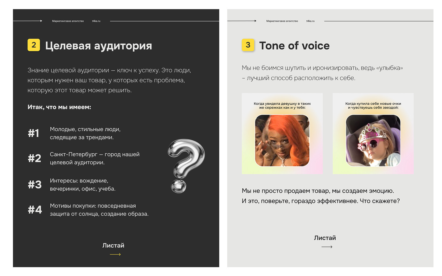Наш клиент хочет помочь покупателям выразить свою индивидуальность. Это не просто продажа аксессуаров, это продвижение «самовыражения», «уверенности», «стиля». Поэтому дружелюбный тон — это только «база».