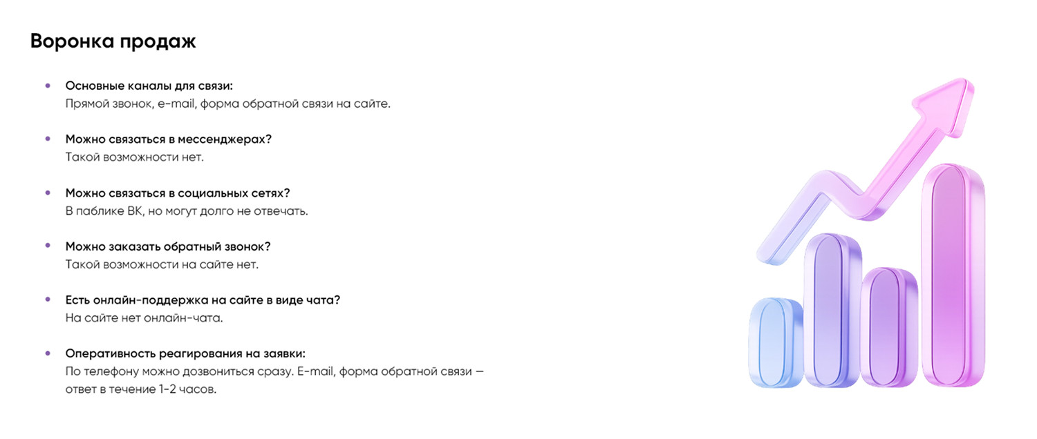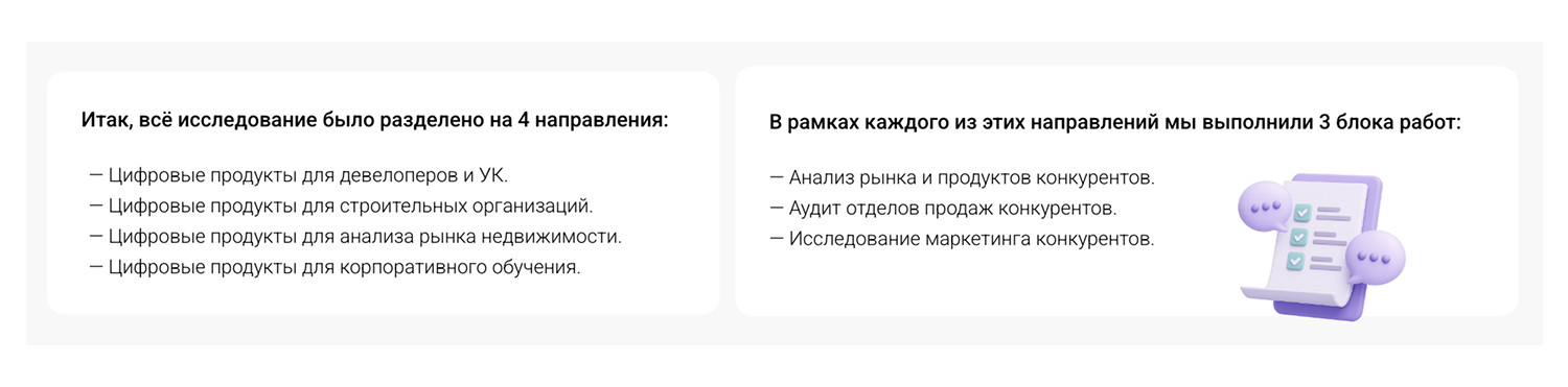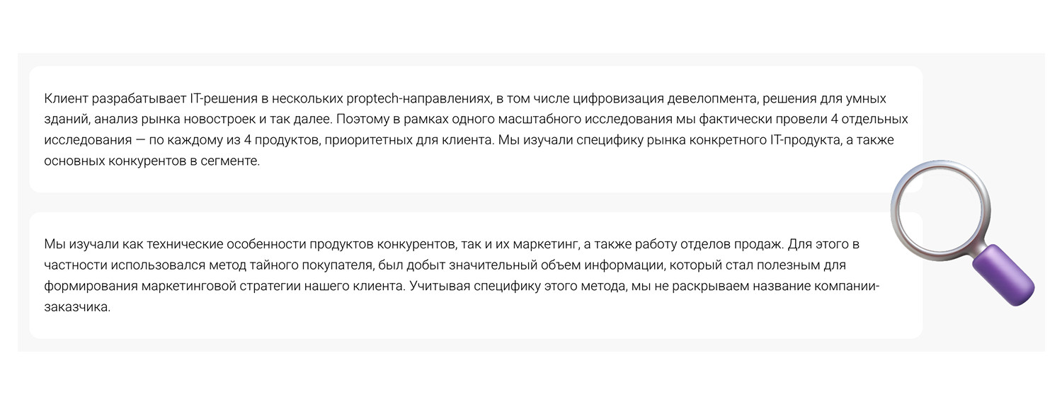 Главной особенностью этого исследования стала его комплексность: Для каждого направления совместно с заказчиком было выбрано 5 конкурентов. Таким образом всего было изучено 20 компаний и их продуктов. В ходе исследования мы применяли следующие методы: анализ вторичных данных, анализ статистической информации, контент-анализ, SWOT-анализ, портфельный анализ, метод «тайный покупатель», контент-анализ, сравнительный анализ, контент-анализ, использование специализированных онлайн-сервисов. В рамках этого кейса рассмотрим ход исследования на примере одного из направлений — цифровые продукты для девелоперов и УК. К ним относятся различные цифровые сервисы для застройщиков, жителей и управляющих компаний. Наш клиент разрабатывает платформу для управления многоквартирными домами. Для него было важно изучить конкурентные продукты, в том числе их функциональные возможности, ценовую политику (эта информация обычно скрывается), особенности маркетинга и специфику продаж. Кроме того, необходимо было провести анализ рынка в этой нише proptech, чтобы получить актуальный информационный срез о трендах, изменениях в потребительских предпочтениях и новых технологиях. Именно анализу рынка был посвящен первый этап исследования. Для выполнения задач этого этапа мы использовали два основных метода: — анализ вторичных данных (в том числе данных Smart Ranking, INTELVISION, ЕРЗ.РФ); — контент-анализ (СМИ, отраслевые издания, сайты компаний, корпоративная информация, отчетность компаний, каталоги и материалы отраслевых мероприятий, данные ассоциаций и пр.). На этом этапе мы определили объем отечественного рынка proptech, финансовые показатели компаний-конкурентов, особенности цифровизации девелопмента, тренды рынка и многие другие аспекты. На втором этапе исследования мы подробно изучили конкурентов нашего клиента и их продукты. На этом этапе мы использовали контент-анализ, метод «тайный покупатель», задействовали специализированные сервисы (keys.so, PR-CY, Серпхант). Нам было важно изучить ключевые особенности процесса продаж у конкурентов, а также получить коммерческие предложения с конкретными цифрами. Для этого мы тщательно прорабатывали легенду потенциальных «покупателей» и вживались в роль представителей девелоперов или управляющих компаний, заинтересованных в продукте конкурентов. Мы старались организовать встречи с менеджерами компаний-конкурентов, в ходе которых узнавали необходимую информацию об особенностях их продуктов. Мы смогли «добыть» большое количество ценных материалов, а также коммерческих предложений. Также в ходе «тайной покупки» и общения с «продажниками» конкурентов мы заполняли анкету чек-лист: оперативность ответов, стиль коммуникации, особенности воронки продаж, работа с возражениями, ценовая политика и критерии. В ходе второго этапа мы подробно исследовали продукты конкурентов, в частности: — проанализировали технические особенности конкурентных продуктов; — проанализировали технической поддержки продуктов, предоставляемой после покупки (условия, выбор тарифа, каналы коммуникации, время реагирования и т.д.). — сравнили продукты конкурентов по их ключевым характеристикам: функционал, сфера применения, удобство использования и так далее; — изучили целевую аудиторию конкурентов, выявили их потребности, предпочтения и 