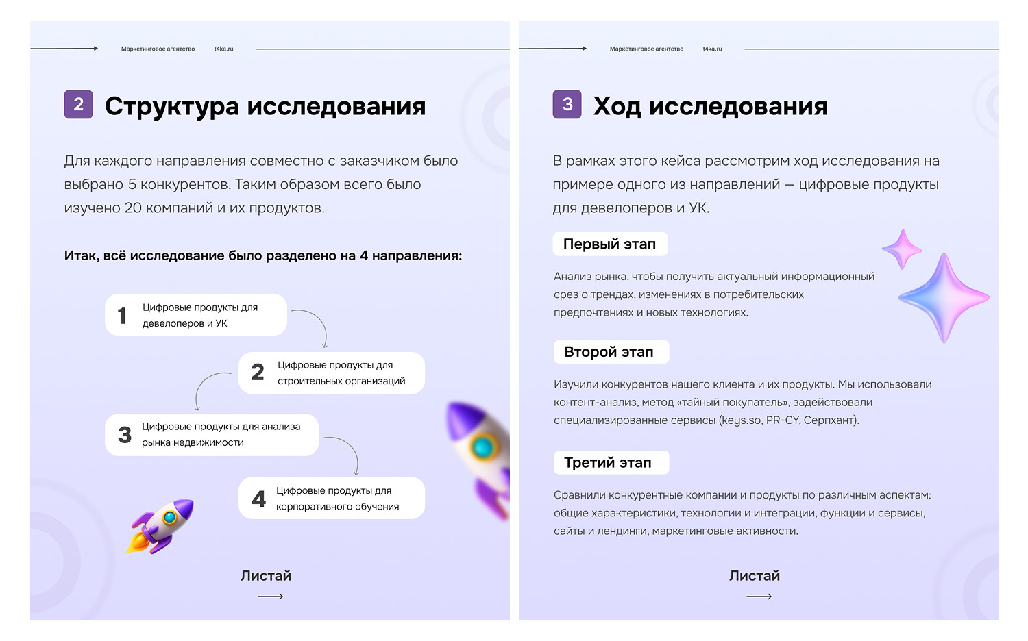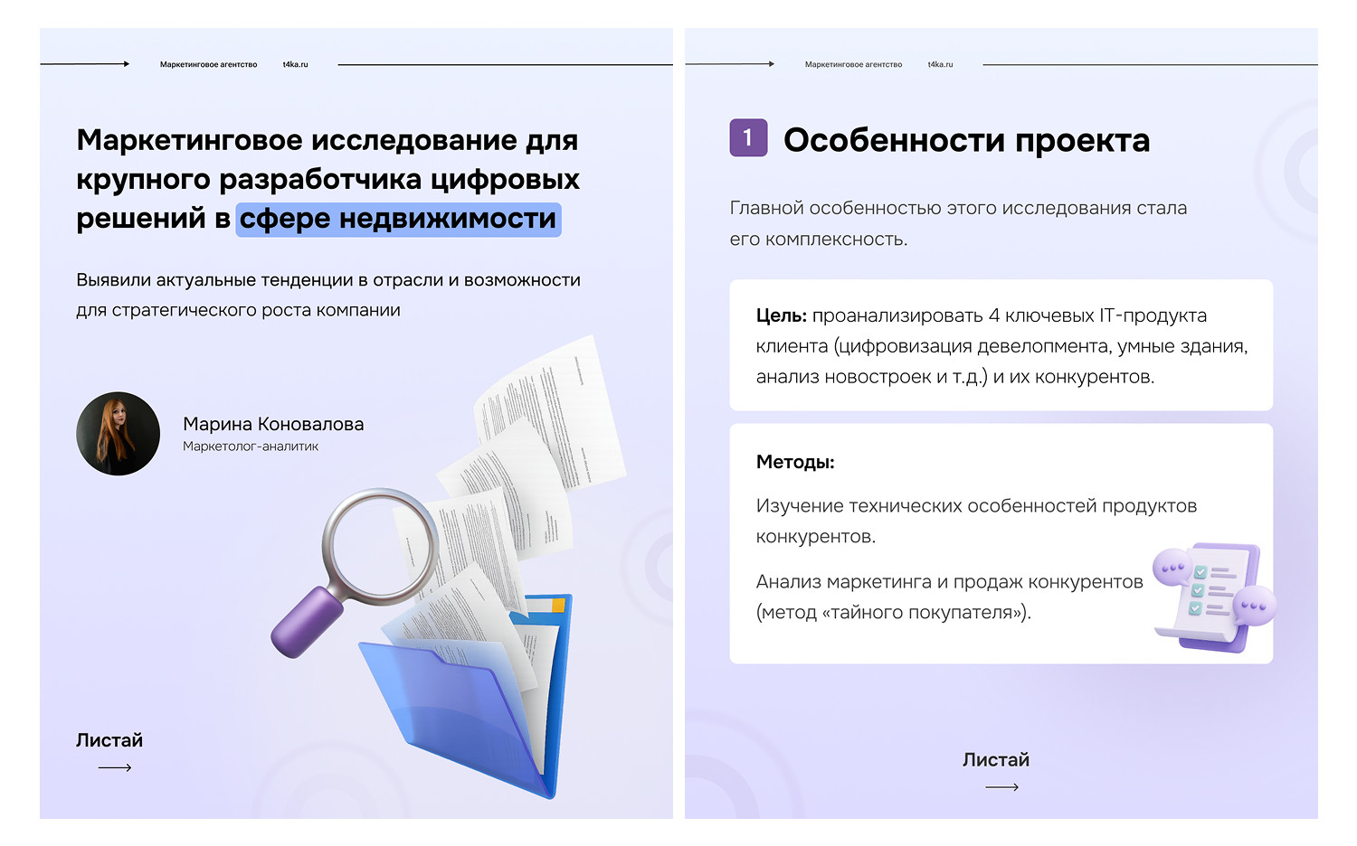 Всем привет! С вами агентство «В точку». В этом кейсе мы наглядно покажем, как масштабное маркетинговое исследование помогает найти точки роста даже в такой сложной нише, как Proptech. Для крупного разработчика IT-решений в сфере недвижимости мы провели комплексную работу, которая по сути объединила четыре исследования в одном. Мы изучили 4 продуктовых направления, 20 компаний-конкурентов, и с помощью метода «тайный покупатель» вскрыли их ценовую политику и тактики продаж, чтобы на основе этих данных предоставить клиенту четкую дорожную карту для развития.