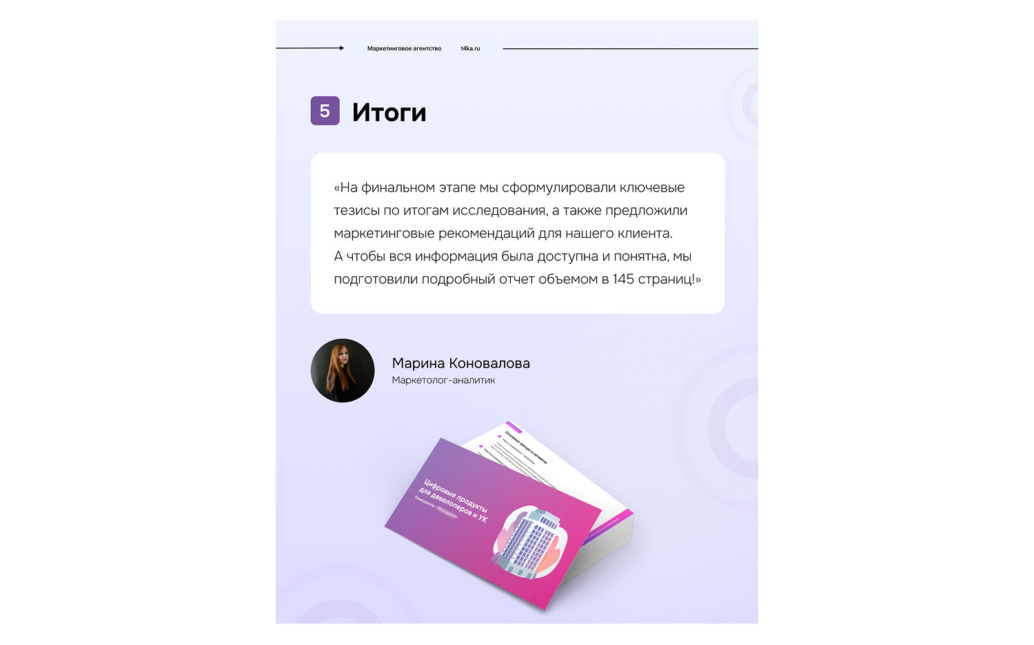 «На финальном этапе мы сформулировали ключевые тезисы по итогам исследования, а также предложили маркетинговые рекомендаций для нашего клиента. А чтобы вся информация была доступна и понятна, мы подготовили подробный отчет объемом в 145 страниц!»