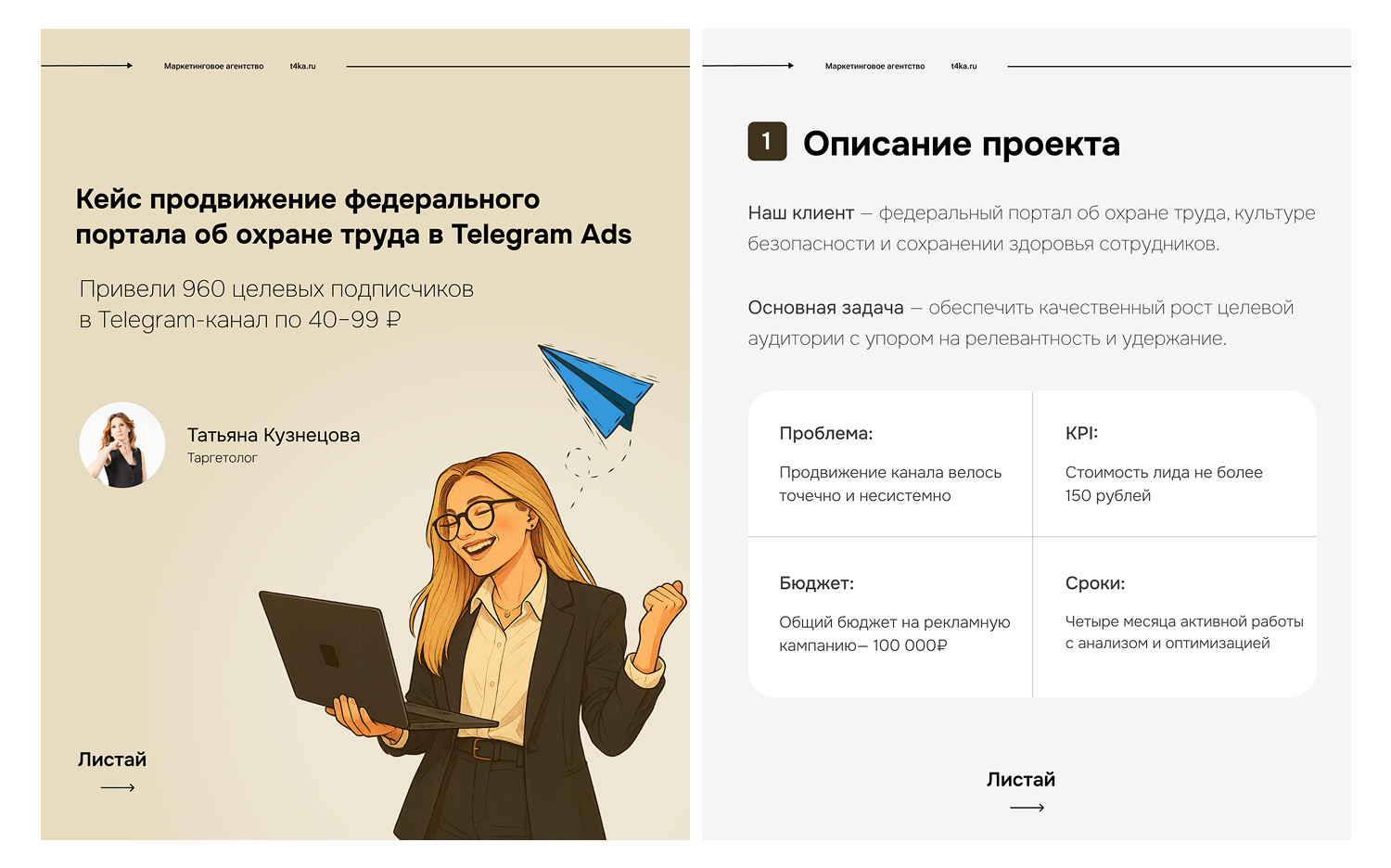 «Привет! Я Таня, таргетолог маркетингового агентства: помогаю каналам в Telegram расти без „сливов“ бюджета.В этом кейсе покажу, как с помощью умного таргета, тестов креативов и точной сегментации мы привели 960 подписчиков по цене от 40 до 99 ₽»