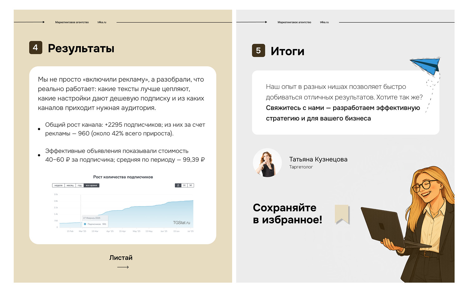 «Этот кейс наглядно демонстрирует, как грамотно спланированная и реализованная рекламная кампания может обеспечить значительный рост числа подписчиков при оптимальном использовании бюджета. Мы уверены, что наш опыт и профессионализм помогут вам достичь подобных результатов. Свяжитесь с нами сегодня, чтобы обсудить ваши маркетинговые цели и разработать эффективную стратегию для вашего бизнеса»