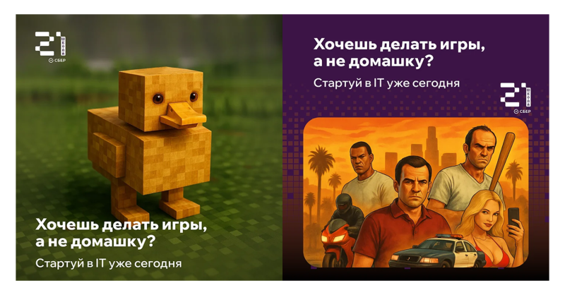 Для школьников мы говорили языком игр, мемов и будущего: «Игры, а не домашка», «В IT не нужна вышка — можно зайти сразу после школы», упоминали ЕГЭ, бронь от армии, страх «не поступить» и заменяли его идеей: «Ты можешь пойти другим путем»