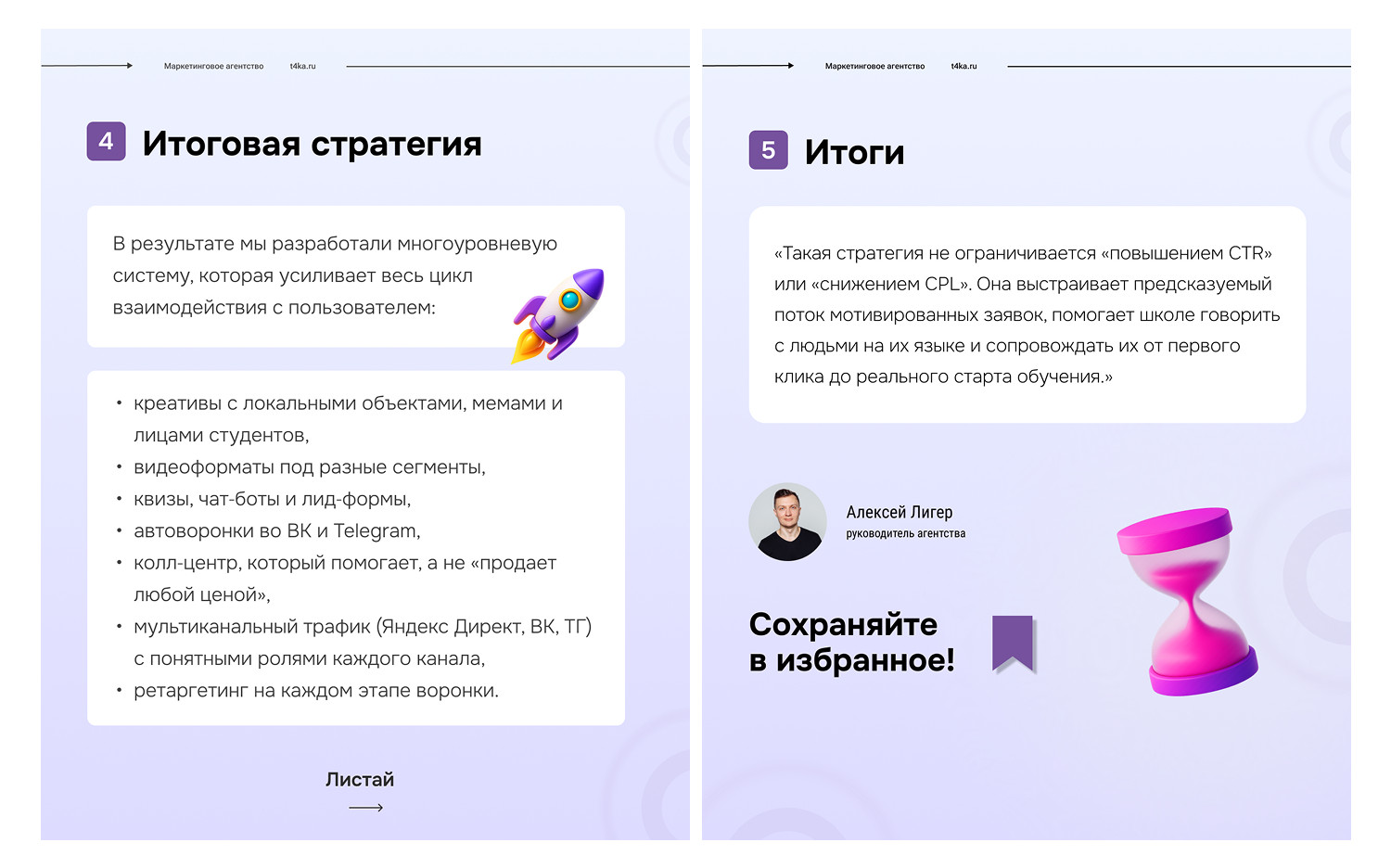 «Такая стратегия не ограничивается „повышением CTR“ или „снижением CPL“. Она выстраивает предсказуемый поток мотивированных заявок, помогает школе говорить с людьми на их языке и сопровождать их от первого клика до реального старта обучения. И именно поэтому мы считаем: это не просто рекламная кампания, а система роста, которую можно масштабировать и на другие IT‑ и образовательные проекты.»