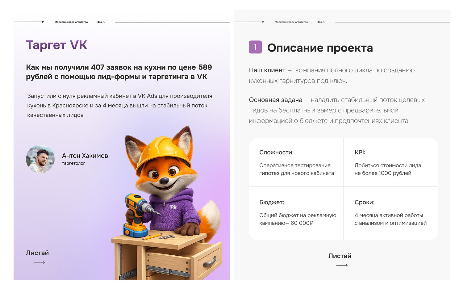 «Привет! Меня зовут Антон, я таргетолог. Специализируюсь на продвижении компаний из сферы ремонта и отделки. В этом кейсе расскажу, как мы запустили с нуля рекламный кабинет в VK Ads для производителя кухонь в Красноярске и за 4 месяца вышли на стабильный поток качественных лидов»