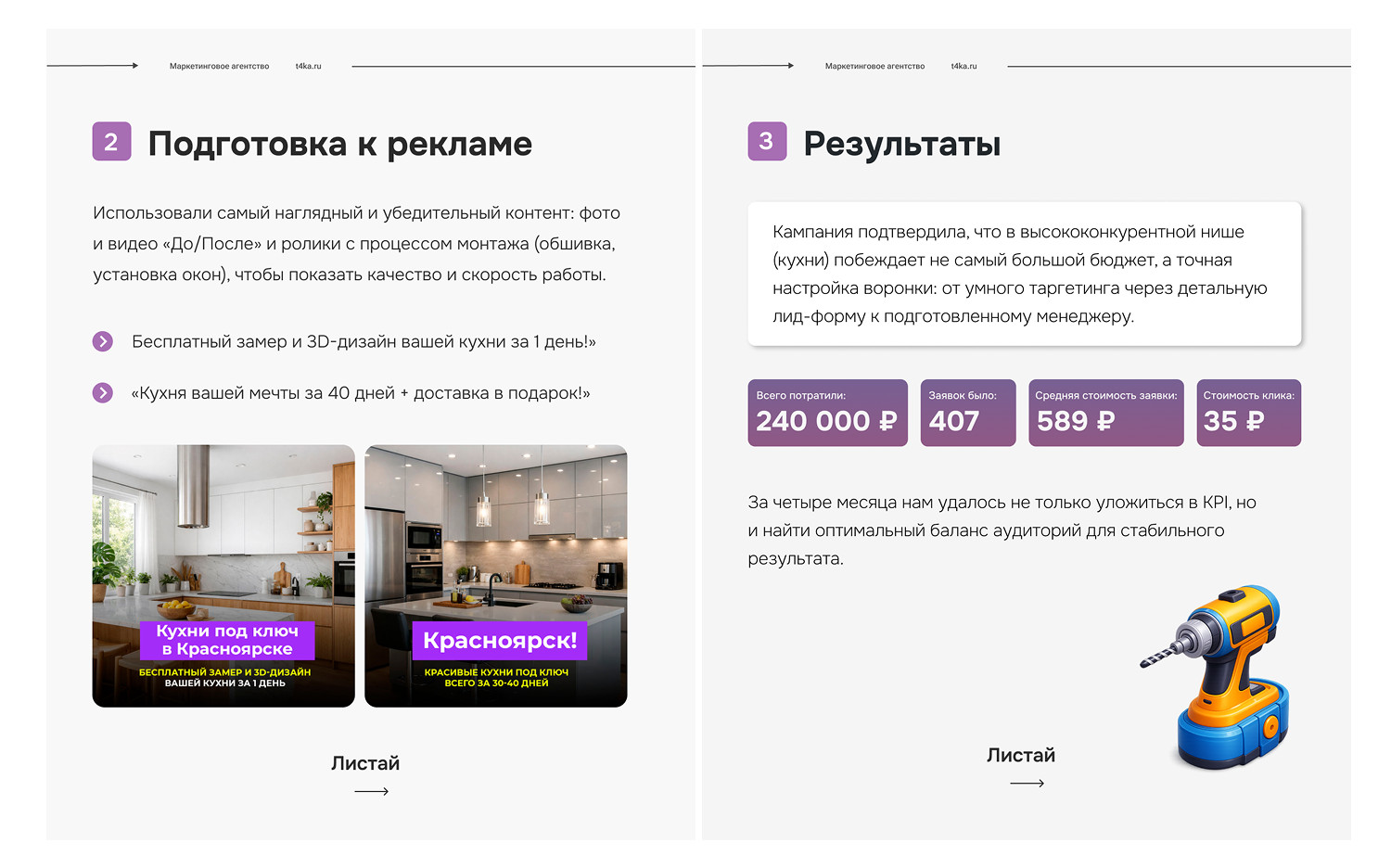Ниже — примеры наиболее результативных креативов и ключевая статистика по ним: Офферы были направлены на создание ощущения большой выгоды и комплексного решения. Основные офферы: Ключевым отличием от простой формы с именем и телефоном стала детализация. Это позволило сразу фильтровать «смотрителей», а менеджерам — готовиться к звонку, имея на руках структурированную информацию, что увеличило доверие и конверсию в диалоге. После нажатия кнопки пользователь попадал на форму, где, помимо контактов, отвечал на важные для менеджера вопросы: За четыре месяца нам удалось не только уложиться в KPI, но и найти оптимальный баланс аудиторий для стабильного результата. Кампания подтвердила, что в высококонкурентной нише (кухни) побеждает не самый большой бюджет, а точная настройка воронки: от умного таргетинга через детальную лид-форму к подготовленному менеджеру.