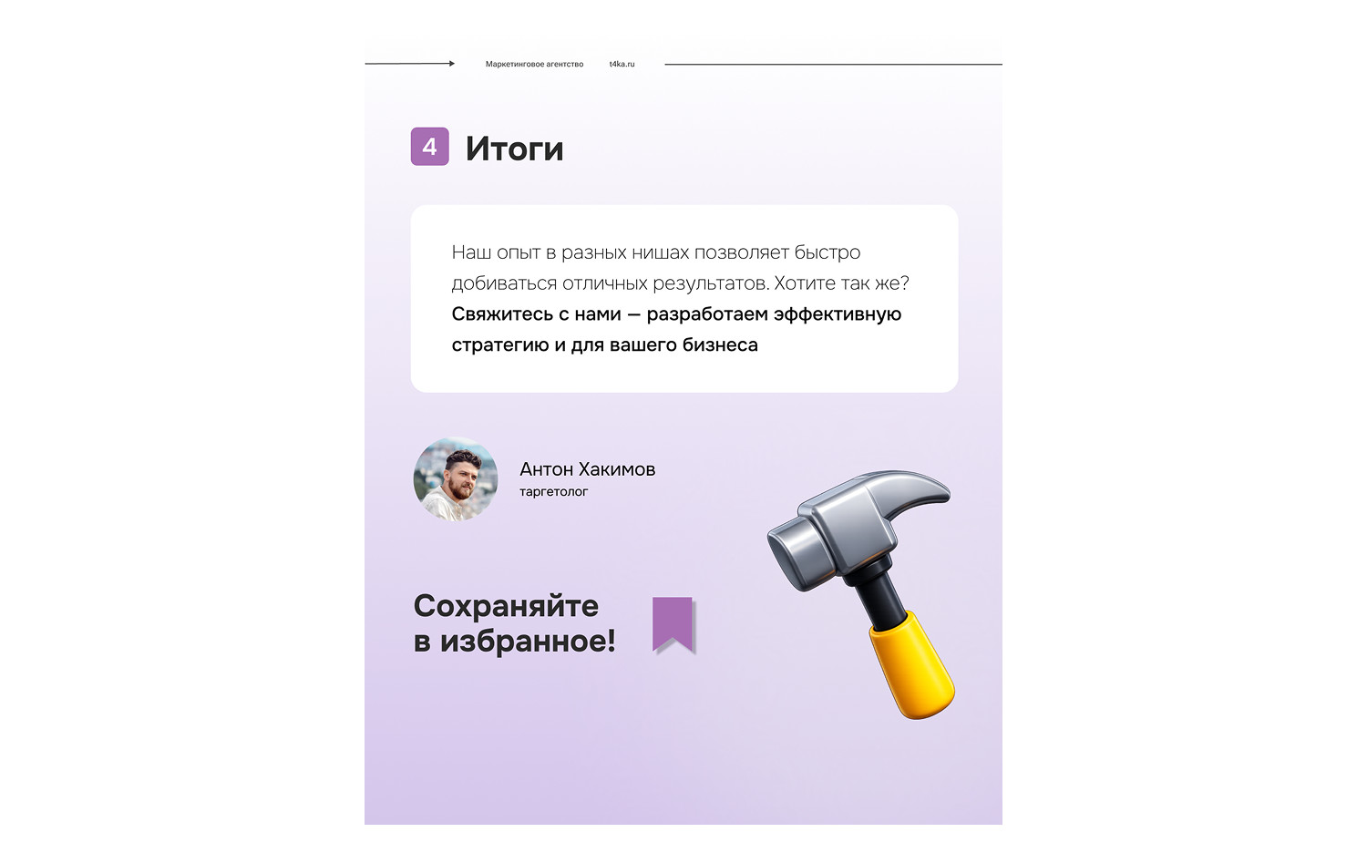 «Этот кейс наглядно демонстрирует, как грамотно спланированная и реализованная рекламная кампания может обеспечить значительный рост числа лидов при оптимальном использовании бюджета. Мы уверены, что наш опыт и профессионализм помогут вам достичь подобных результатов. Свяжитесь с нами сегодня, чтобы обсудить ваши маркетинговые цели и разработать эффективную стратегию для вашего бизнеса»