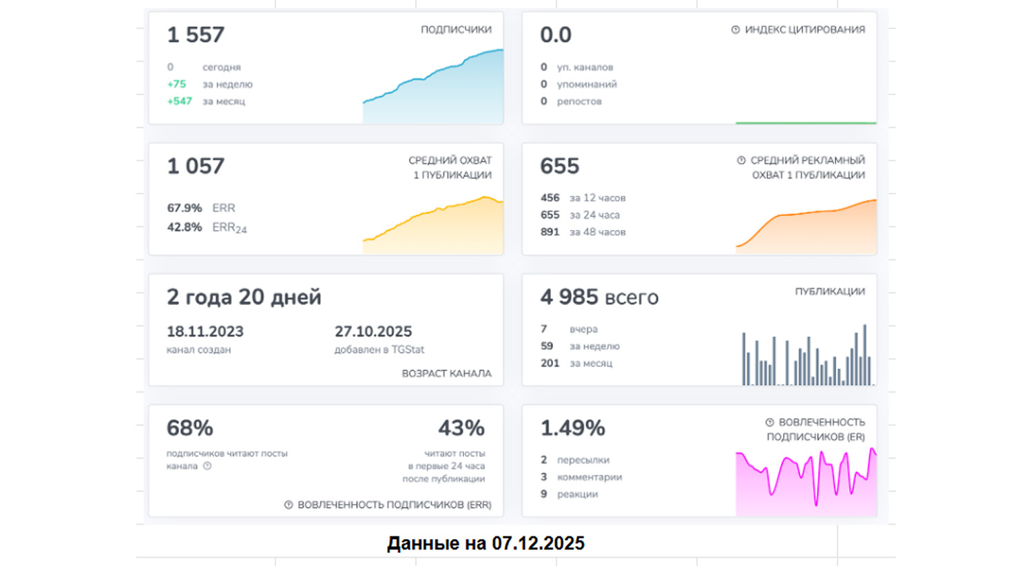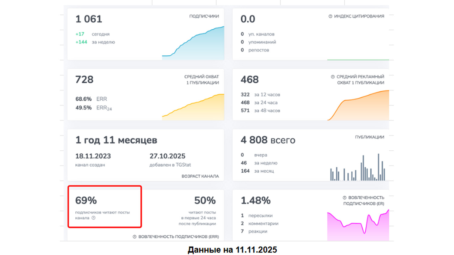 Параллельно важно было выстроить понятный план масштабирования: не просто увеличивать расход, а делать это только после того, как найдены связки «канал + текст», которые дают приемлемую цену подписки. Контекстная реклама / Telegram Ads Результаты по рекламе (Telegram Ads) 1 609 — Подписок за период 64 771₽ — Общий расход (без НДС) 40,26₽ — Средняя стоимость подписки Лучшие дни по стоимости подписки: 30.10: 15,08 руб. за подписку 31.10: 15,38 руб. за подписку Это показало, что при правильной связке можно получать подписчиков очень дешево, а дальше важно масштабировать именно такие связки. 69% подписчиков читают посты канала — это отличный показатель вовлеченности, который подтверждает, что мы привлекли именно целевую аудиторию. Все решения принимались по цифрам из ежедневного отчета: расход, показы, клики, действия и стоимость подписки. Мы смотрели динамику стоимости подписки по дням и не масштабировали бюджет вслепую, пока не видели стабильные результаты. Это позволило держать управляемую среднюю стоимость подписки и объяснять предпринимателю, какие действия привели к итоговым цифрам. Этот кейс показывает, что реклама в Telegram Ads работает предсказуемо, когда вы управляете не кликами, а конечной целью — подпиской. Важно не просто увеличивать расход, а сначала найти рабочие связки и только потом расширять объем. Комплексный подход в продвижении канала — это тест креативов, контроль ежедневной цены подписки и регулярная оптимизация размещений. Такая схема хорошо масштабируется: сначала наводим порядок в аналитике и закупке, затем постепенно увеличиваем объём трафика, не раздувая стоимость подписки. «Раньше мы не понимали, почему в одни дни подписчики приходят дешево, а в другие цена резко растет. Команда разложила продвижение по цифрам и сделала понятный план: что тестируем, что оставляем, что отключаем. В итоге мы получили стабильный поток подписок и четкое понимание, как масштабировать рекламу дальше. Планируем продолжать тесты по новым каналам и креативам, чтобы удерживать стоимость подписки и наращивать объем». «Этот проект хорошо показывает простую вещь: в Telegram Ads выигрывает не тот, кто дает больше бюджета, а тот, кто быстрее находит рабочую связку „оффер + площадка“ и контролирует стоимость подписки каждый день. Методика подходит брендам и магазинам, которым важен быстрый рост аудитории, но без хаоса в расходах. Если хотите повторить, начните с тестов на малом бюджете и фиксируйте результат по подписке, а не по кликам. Нужен прогнозируемый рост? Приходите, соберем медиаплан и сделаем систему, которую можно масштабировать». Алексей — Руководитель агентства
