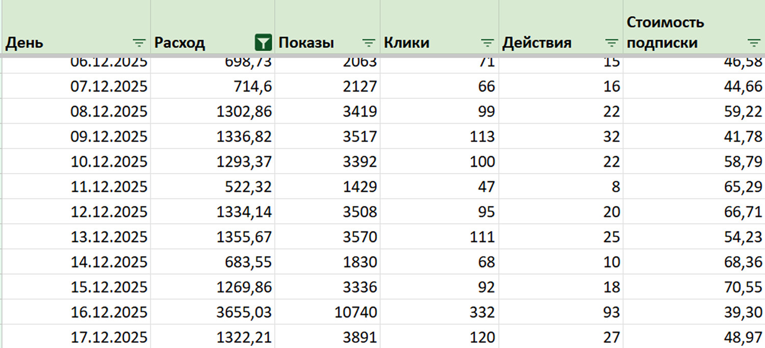 На старте не хватало понятной системы, которая связывает деньги и реальный результат: подписки. По отчетам видно, что стоимость подписки могла сильно меняться от дня к дню: например, 30.10 она была 15,08 руб., а уже 12.11 доходила до 92,17 руб. Это означало, что проекту нужен был контроль за тем, где показываемся и с каким сообщением, иначе бюджет будет расходоваться без предсказуемости.