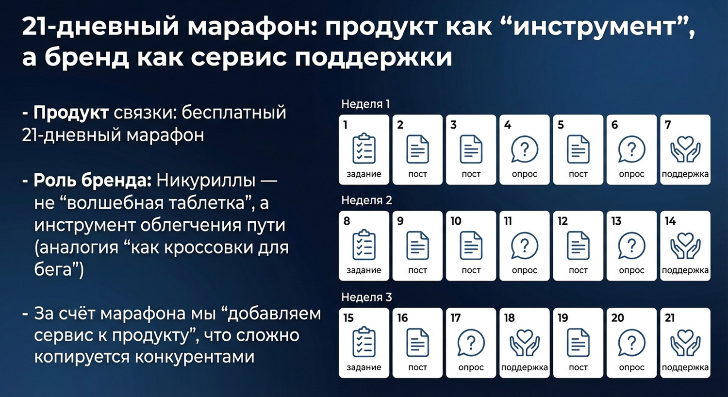 Закрытое сообщество в VK + чат-бот в Senler для проведения 21-дневного марафона поддержки. Продукт становится не таблеткой, а частью системы.