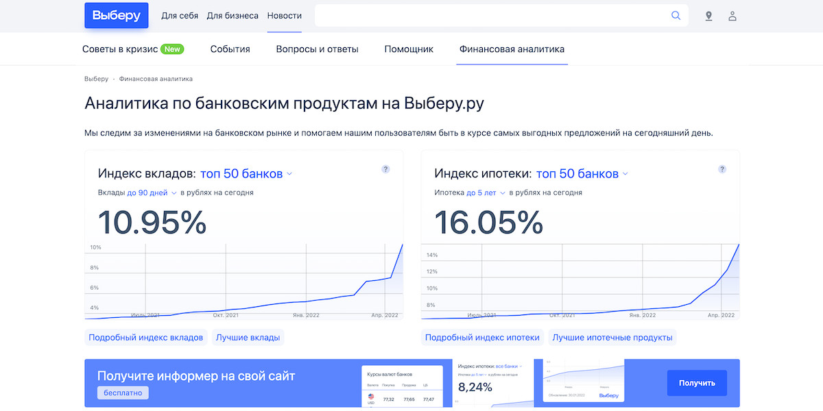 Финансовый маркетплейс «Выберу.ру» объединил все аналитические инструменты в раздел «Финансовая аналитика». С 2015 года сервис агрегирует предложения банков, страховых и микрофинансовых организаций и на их основе выстраивает собственную аналитику. Сегодня она учитывает более 10 000 финансовых продуктов.