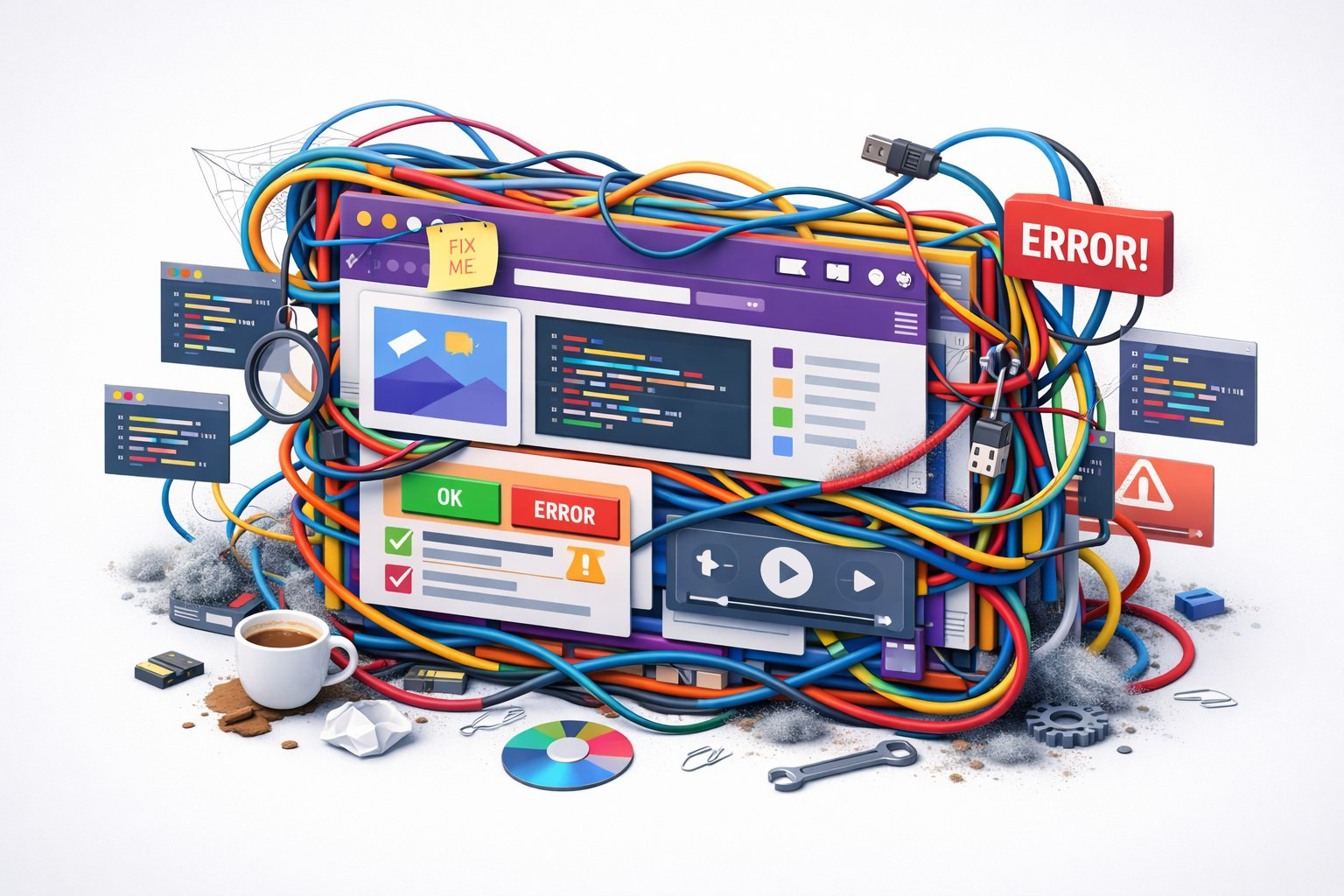 возникает из трёх источников: 1. Срочные правки «на коленке». Клиенту нужно было вчера. Разработчик сделал быстро, как смог. Потом забыли переделать как надо. Через год таких «быстрых» решений набирается десяток, и они начинают конфликтовать друг с другом. 2. Устаревание. То, что было современным три года назад, сегодня — тормоз и дыра в безопасности. Браузеры меняются, стандарты ужесточаются, хакеры умнеют. Сайт, который не обновляется, стареет быстрее iPhone без апдейтов. 3. Накопление мусора. Файлы, которые уже не используются. Запросы в базе данных, которые никто не чистил. Плагины, которые поставили «попробовать», а потом забыли отключить. Всё это лежит мёртвым грузом и замедляет работу.