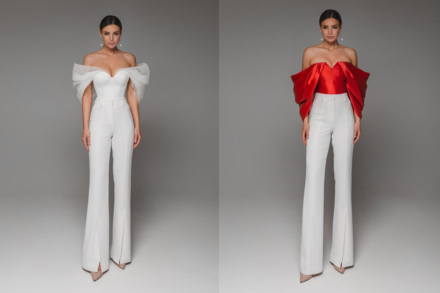 Блестящее платье невесты часто стали выбирать не только как второй наряд на вечеринку, но и в качестве основного. Сочетание лаконичного кроя и мерцающей ткани ещё никого не оставляло равнодушным. Красивые фотографии и восторженные взгляды окружающих вам гарантированы однозначно! Всё чаще невесты отдают предпочтение неоклассическим вариантам. Корсеты, короткие топы и бра также стали смелым решением для многих невест. Их можно стилизовать с пиджаками разных форм и брюками — либо с юбкой длины макси. Современные невесты полюбили белые брючные костюмы. И этот тренд тоже уже хорошо прижился и по своей актуальности всё больше набирает обороты. Такой образ — это хорошая альтернатива платью и подойдёт для росписи или фотосессии. Актуально выглядит свободный крой, оверсайз или сочетание платья с пиджаком. Выбрав наряд, можно уже приступить к подбору аксессуаров. В этом сезоне будет ещё больше вариантов, чем раньше: мини-сумочки, объёмные серьги, чокеры, вуаль, банты, крупные ободки и даже шляпы. Фата с надписями и тематическими рисунками — не новшество, но свою популярность у невест обрела именно сейчас. Некоторые персонализируют аксессуары вышитыми словами и фразами, которые несут в себе глубокий смысл для молодожёнов. Вдохновением послужила фата Анджелины Джоли с рисунками её детей и Хейли Бибер с вышитым признанием в любви. Туфли — это уже как отдельный вид искусства. Многие невесты любят сделать акцент именно на них, выбирая яркие дизайнерские модели, которые хочется разглядывать. Уже несколько лет девушки экспериментируют также с кедами и грубыми ботинками, чтобы разбавить свой образ. С этого сезона список дополнился актуальными ботильонами и казаками. С лаконичным платьем можно позволить любые эксперименты с обувью.