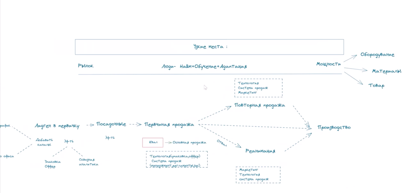 Все рынки проходят примерно одни и те же циклы (рис. 1): Рост — вначале чуть менее активный, далее набирает обороты. Затем выходит на плато, после начинает падать. Перед тем, как задуматься о совершенствовании процессов в бизнесе, нужно ответить на вопрос: на каком этапе компания находится сейчас. Если компания, находится там, где выделено на рисунке 2, то рынок начинает падать: Рынок начинает схлопываться. Если вложиться в улучшение системы продаж, довести до идеала маркетинг, то результат получится примерно такой же, как если бы, люди выпрыгнули из самолета: у кого нет парашюта — будут падать быстрее, с парашютом будут падать медленнее, но неизбежно окажутся на земле. В данной ситуации точкой роста станет не внутренняя работа над проектом или процессами, точкой роста будет: Пример: Вы внедряли CRM-системы для интернет-магазинов и охватили все интересующие варианты. Обратите внимание на производство, оно только-только доходит до внедрения этих систем. У вас уже есть техническая команда, вам необходимо только переупаковаться и изменить свой алгоритм работы. Пример: Вы делали сайты. Вы понимаете, что рынок уже «съеден», на нем много не заработаешь, и начинаете на вашу базу, на ваших текущих клиентов предлагать другой продукт — например, маркетинговые услуги. Вот два варианта выхода из ситуации падения рынка. Конечно, можно уйти в совершенно другой бизнес. Минус этого подхода — вы не сможет использовать преимущества от уже накопленных ресурсов, знаний, экспертизы Если компания находится на рынке восходящего роста (рис.3) или в положении плато и ей далеко до падения, в таком случае, имеет смысл работать над внутренними процессами, упаковкой и качеством. Как над этим работать?Первое, что важно помнить: доход будет соответствовать развитию рынка — если рынок растет, то и доход будет расти, вне зависимости работают в компании над процессами или нет. Если собственник отмечает рост, нужно проанализировать: это результат усилий или все середнячки на рынке также растут.? Руководители могут присваивать рост правильным действиям внутри компании, хотя на самом деле это не так. Поэтому очень важно сравнение именно со средними игроками, а не с лидерами, которые захватывают рынок. Если у компании такая же динамика, как у всех, то это результат рынка. Это важно понимать. Если ничего не делать, то динамика доходов соответствует циклу рынка — если конечно не заниматься саморазрушением. А если поработать над качеством, над процессами, то динамика может быть такой, как показано на рисунке 4: Можно расти гораздо интенсивнее конкурентов. Как этого добиться? Первый шаг, о котором говорилось выше, — определить на каком этапе сейчас находится наш рынок. Второй шаг наглядно можно рассмотреть на рисунке 5: Начинать анализ бизнес-процессов стоит всегда с производства. Производство здесь в широком смысле — услуги, товар или оптово-розничная торговля. Пример: В товарном бизнесе важно понимать, если увеличиваешь приход лидов, нужно увеличивать и объем товара. Задайте себе вопросы: Если у вас производство, то нужно понять: Если у вас услуга, вопросы следующие: Если ответ на эти вопросы: «Да, я знаю, как обеспечить производство для большего количества лидов, для большего количества заказов», то следующее, на что мы смотрим — это первичные продажи. Нет смысла вкладыват