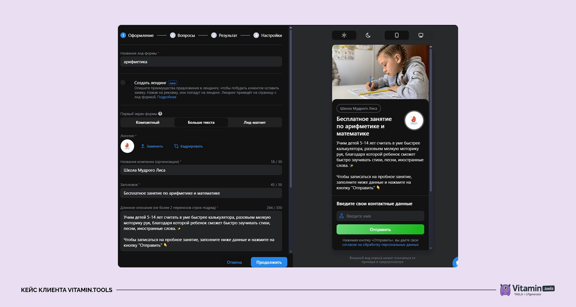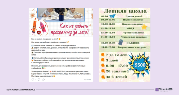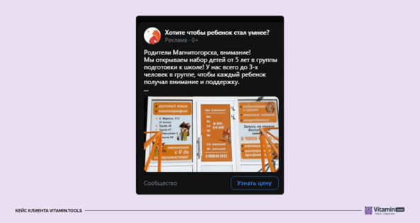 В 2022 году к нам обратилась школа по скорочтению и развитию внимания «Школа Мудрого Лиса». Они работают по франшизе в г. Магнитогорске. Аудитория — родители детей 4–10 лет.