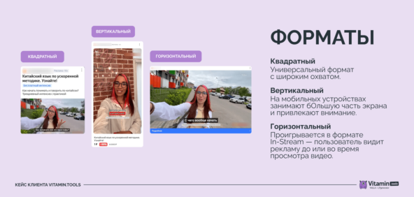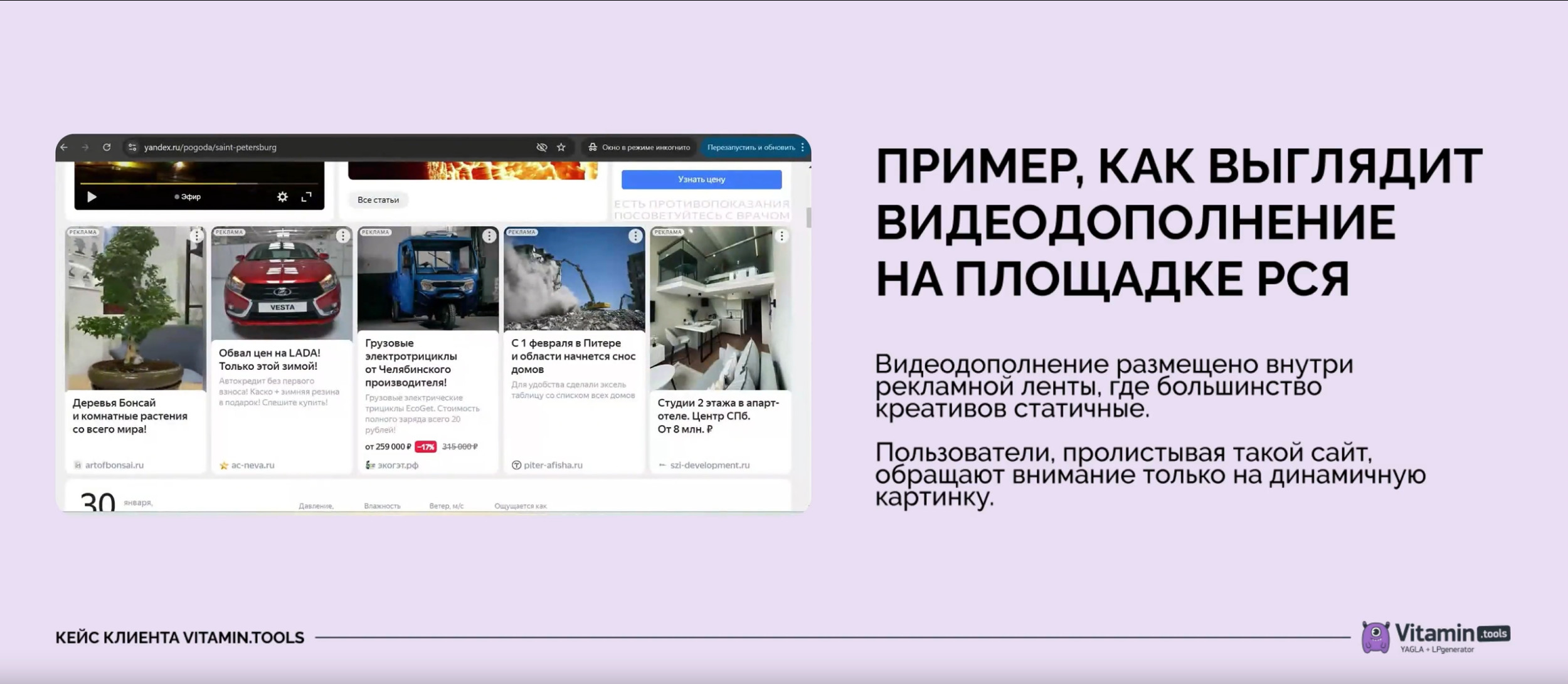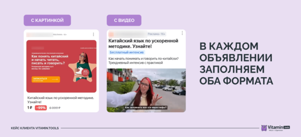 Параллельно пробовал запускать рекламу через Мастер кампаний, где можно показывать объявления не только в РСЯ, но и в Поиске. Открутил 15 000 рублей и, несмотря на широкий охват, получил лиды дороже KPI. Поэтому рекламу в Мастере кампаний в итоге отключил. Трафик вели на лендинг с рекламой трёхдневного интенсива, после прохождения которого пользователям предлагали оплатить платный курс. На интенсиве слушатели могли попробовать свои силы в изучении китайского языка. Познакомиться с иероглифами и тонами. Попробовать научиться понимать и произносить 20 фраз. У заказчика было пять готовых лендингов, эффективность которых я сравнивал с помощью А/Б-тестов. Их можно было запустить в Директе, используя функционал А/Б-экспериментов, но пришлось бы делать много дублей рекламных кампаний, из-за чего обучение алгоритмов могло сбиться. Поэтому я искал другие способы: Если вам для работы достаточно одного домена, Вариокуб — хорошее решение. Но если этого мало, A/B-тесты от рекламной экосистемы Vitamin.tools, возвращающей до 18% от пополнения рекламы — удобный и доступный вариант. У заказчика уже были качественные видео для рекламы на YouTube. Вместо того, чтобы тратить время и бюджет на создание новых роликов, я адаптировал их под рекламу в РСЯ, запустив видеодополнения — формат текстово-графических объявлений с видео. По моему опыту, этот инструмент работает в разных сферах: инфобизнесе, строительстве, B2B. Видео в рекламе помогает снизить стоимость покрытия и расширить охват, поэтому я всегда рекомендую заказчику его использовать. Если у клиента нет готового контента или бюджета на съемку, создаю простые ролики в Supa. Почему видеодополнения работают лучше статических объявлений: Причины могут быть разными: кто-то не готов вкладываться в создание креативов, а кто-то попросту не доверяет эффективности видеодополнений. Для нас это стало конкурентным преимуществом: с помощью видео мы могли выделиться, привлечь больше целевых пользователей и получить дополнительный объём трафика. Видеодополнения для РСЯ можно сделать в любом редакторе. Главное — правильно адаптировать ролики: длиной от 5 до 60 секунд, с субтитрами и с минимумом деталей. Пользователи не сидят на сайтах РСЯ специально и не вглядываются в рекламу. Простые и понятные визуалы работают лучше, а субтитры помогают зацепить тех кто смотрит видео без звука. Настройка объявлений: Тестирование и оптимизация Для оптимизации видеодополнений я провёл A/B-тесты. Разбил аудиторию на пять сегментов: предприниматели, эмигранты, экспаты, энтузиасты и специалисты, работающие с китайскими компаниями. Под каждый сегмент подготовил семь вариантов заголовков, текстов и изображений. В группу добавлял не больше пяти объявлений одновременно, чтобы алгоритм не зацикливался на одном варианте и не ограничивал тестирование. Менее эффективные объявления отключал, на их место добавлял новые. К сожалению, в Директе нельзя включить равномерное чередование объявлений в группе: совсем быстро система выбирает наиболее эффективное и «залипает» на нем. Эксперименты с форматами В ЕПК (Единая перформанс-кампания) можно использовать два варианта текстово-графических объявлений в РСЯ: с картинкой и с видео. Я протестировал оба: Результаты: Видеодополнения однозначно усиливают кампанию, но лучше работают в связке с изображен