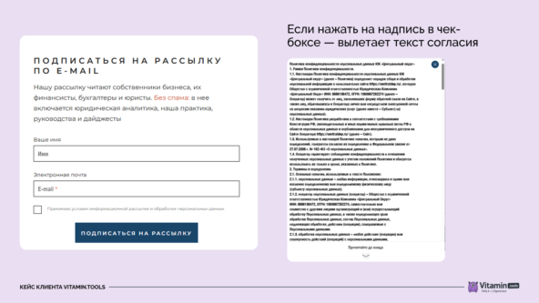 На руках — письмо от РКН и 10 рабочих дней на официальный ответ. А в компании нет юриста. На запрос Роскомнадзора нужно ответить в течение 10 рабочих дней — так указано в ст. 20 закона № 152-ФЗ. Продлить срок ещё на 5 рабочих дней можно, если сразу направить мотивированное уведомление. Что именно считать «мотивом» — не объясняется. Но проверяющие ждут конкретики: ссылки на документы, внутренние приказы, копии писем с запросами. Например, можно приложить приказ о проведении внутренней проверки, указать даты сбора информации или сослаться на официальное обращение к подрядчику, если часть данных находится у него. Если не ответить в срок или проигнорировать запрос — будет штраф. Зарегистрируйтесь как оператор персональных данных. Это необходимо, если вы хоть как-то работаете с данными пользователей: собираете, храните, передаёте, анализируете или даже просто получаете доступ к информации о человеке. Обработка происходит, например, когда человек оставляет заявку, заполняет квиз, подписывается на рассылку, или просто заходит на сайт с подключённой Метрикой или cookie. Даже если вы не сохраняете эти данные у себя, но они проходят через ваш сайт — вы уже оператор. Пример: Проверьте формы. Под формой должен быть чекбокс: пользователь сам ставит галочку и подтверждает согласие. Текст рядом — понятный и короткий. Например: «Я согласен на обработку персональных данных». Внутри этой фразы — ссылка на отдельную страницу с условиями. Если вы спрячете текст, поставляете галочку по умолчанию или не добавите ссылку — Роскомнадзор это засчитает как нарушение. Пример: Не забудьте про cookie. При первом заходе на сайт покажите всплывающее окно или баннер, где пользователь сможет принять или отклонить сбор данных. Уведомление должно сообщать, что вы используете сторонние сервисы — например, Яндекс Метрику. Использовать сервис Google Analytics в России запрещено. Google Формы, кстати, тоже. За них компания может получить штраф до 6 000 000 ₽. По умолчанию сайт собирает только технические cookie — те, которые нужны для авторизации, оформления заказа или сохранения пользовательских настроек. Для сбора аналитики, рекламы и других необязательных данных нужно получить согласие. Предложите пользователю выбор: принять все cookie или выбрать только необходимые. Это можно реализовать через кнопки «принять всё» и «настроить». Когда приходит запрос от Роскомнадзора, проверяют не только сайт, но и то, как выстроена работа с данными внутри. Отсутствие договоров, приказов или согласий — основание для штрафа. Вот какие документы запрашивают в первую очередь: — Политика конфиденциальности. Описывает, какие данные собираются, зачем и на каком основании. Указывает способы и сроки хранения, перечень третьих лиц, которым передаются данные, и порядок отзыва согласия. — Согласие на обработку данных. Может быть отдельным документом или частью политики. Включает перечень данных, цель и срок обработки, передачу третьим лицам и способ отзыва согласия — например, через форму на сайте или по email. — Договор с подрядчиком. Обязателен, если вы передаёте базу внешнему специалисту — например, таргетологу, разработчику или администратору. В договоре фиксируют объём данных, цели обработки, распределение ответственности и ограничения по использованию. — Приказ о назначении ответственного. Документ, в к