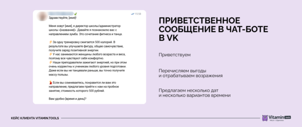 В категории мам прямые ключи с названиями направлений не работают. Родители выбирают в первую очередь секцию по танцам. Когда ведёшь трафик в личные сообщения, часть людей открывает чат — и молчит. Чтобы не терять такие лиды, мы подключили чат-бот, который сразу включается в диалог и помогает отсеивать случайные заявки. Автоворонку настроили через Senler. Бот квалифицировал пользователей по направлению взрослые/дети, интересующему стилю и предпочтительному способу связи. Он также отвечал в нерабочее время, когда администратор студии был офлайн. Цепочку сделали короткой — чтобы не перегрузить человека на первом касании: Если пользователь не отвечал, бот больше не беспокоил. Дальнейшая коммуникация оставалась за заказчиком: при желании они могли позже вручную вернуть диалог. Аудиторию не сегментировали, показывали рекламу всем, в том числе новичкам. Для их привлечения добавляли сразу закрытие возражения — что танцы подойдут даже новичкам. В конце добавляли призыв к действию. По нашему опыту он повышает конверсию на 30%. В креативы включали: Показы запускали только в ленте и клипах — с ограничением по частоте. Исключили форматы с вознаграждением за просмотр (там часто кликают боты) и рекламу в середине видео (непредсказуемая точка входа). Трафик вели на сообщения сообщества. Таргет — женщины, живущие в районе Орехово и в радиусе 3 км. Первая продажа пришла уже на тестах. CPL на старте: Иногда реклама настроена по всем правилам: охваты есть, клики идут, бюджет тратится — но внезапно что-то случается и заявок нет. Перезапускаешь — одна заявка пришла и снова тишина. Обращаешься в техподдержку VK, а в ответ шаблонные советы: «Расширьте аудиторию», «Поменяйте креатив». Хотя очевидно, что дело не в настройках. Мы решаем такие случаи быстрее, потому что работаем через рекламную экосистему Vitamin.tools. Во-первых, они возвращают до 18% от пополнения бюджета. Во-вторых, у них есть аккаунт-менеджеры, с которыми можно связаться напрямую в Telegram. Когда одна из кампаний у нас «встала», менеджер помог разобраться, и лиды пошли снова. К 8 марта мы запустили рассылку на тех кто писал в сообщество. Предложили купить абонемент по спеццене, но получили много отказов. «Не могу. Не хочу. Не знаю» — заказчик собрал все причины и передал нам. Эти формулировки мы использовали при оптимизации кампаний. Что сделали: Проблема 1. Многие не писали триггер («+»), из-за чего бот не запускался, и мы теряли заявки. Настроили его так, чтобы он срабатывал на любое входящее сообщение. Проблема 2. Раньше заявки обрабатывал один администратор — он просто отправлял скрин с описанием программы и спрашивал: «Вас записать?». Пользователи не вовлекались и уходили. Мы предложили не прерывать контакт, а вести диалог: рассказывать об акции, школе, направлениях, задавать уточняющие вопросы. Если человек включается — можно позвать на короткий созвон. Он помогает не только продать, но и сохранить базу. Проблема 3. Раньше заказчик не делал прогревы. Мы рекомендовали запускать рассылки хотя бы раз в неделю — это входит в стоимость. Цель — прогрев и повышение записи на пробное занятие. В рассылках можно делиться акциями, видео с занятий, отзывами. Сейчас как раз реализуем эту идею. Период: с февраля 2025 года по настоящее время. Бюджет: 52 000 рублей. Результат: 115 заявок. Средняя цена заявки: Конверсия в поку