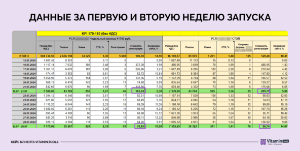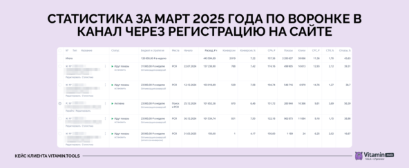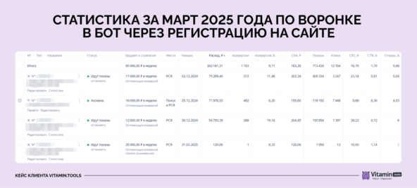 Как работала воронка в этом проекте: У заказчика уже был опыт продвижения, но заявки выходили слишком дорогими. Мы начали с составления медиаплана, чтобы понять, сколько можем тратить на рекламу, оставаясь в рамках KPI. Сделали несколько прогнозов, но ориентировались на средний, так как ниша узкая, а главный продукт дорогой — курсы заказчика стоят 150 000–300 000 рублей. Мы предполагали, что в Директе цена подписчика в бот и канал будет выше, чем в Telegram Ads, но ниже верхнего KPI — 300 рублей. Затем исправили типичные узкие места: технические мелочи, непрозрачные ссылки, слабые офферы. Работали на автоматических настройках, запускали таргетинг по ключевым словам и LAL. Вышло 15 разных сегментов аудиторий, на которых мы рекламировались в РСЯ. Стратегия — оптимизация конверсий с целями: регистрации в боте и подписки на канал. Стоимость конверсии не выставляли, чтобы не занижать показы. Аудитории корректировали по возрасту. «Минус 100%» — на людей до 18 лет и старше 55 лет. Результат мы получили в первую неделю. В первые две недели запуска стоимость регистрации в бот составила 163 рубля через длинный сайт и 209 рублей через одноэкранник. Подписка на Telegram-канал также была в пределах KPI: один подписчик выходил по 165 рублей. Чтобы снизить стоимость целевого действия, следили за качеством трафика. Отключали плейсменты с кликабельностью больше 5% — почти всегда это сигнал о «ботном» трафике. И удаляли площадки, с которых не было регистраций. Больше всего целевых действий мы получили с «Дзена», «ВКонтакте» и «Яндекс Почты». Параллельно отслеживали конверсию лендингов. Через две недели стало ясно: для воронки в бот лучше работает длинный формат. Люди читали, вникали, понимали, зачем это им — и оставляли заявку осознанно. С короткой страницы конверсия была ниже. Мы отключили кампанию, которая вела в бот через одноэкранник. Чтобы сделать такой лендинг, не нужен программист. Можно собрать его в LPGenerator — конструкторе лендингов от рекламной экосистемы Vitamin.tools. Там есть всё нужное: интеграции, аналитика, поддержка. А ещё — высокая скорость загрузки и бесплатная тестовая неделя. Этого хватит, чтобы запустить тестовый вариант и проверить гипотезу. Регистрации в бот через длинный сайт по 78 рублей, через одноэкранник — по 96 рублей. Мы продавали через запуски, а прогревали аудиторию в канале. Поэтому все заказы поступали массово из одного источника. Из-за этого с обеими воронками возникли сложности: регистрации проходили, но мы не могли отследить их источник. Чтобы восстановить цепочку, мы подключили нулевые регистрации в GetCourse. Внешне для пользователя это выглядит как обычная регистрация на сайте, но для нас в системе создаётся карточка покупателя со всеми его действиями. Как это настроить: В момент отправки в Метрику передаются данные о конверсии — регистрации на сайте. GetCourse может подтягивать данные из UTM-меток, но у нас это, к сожалению, тогда не было настроено. Мы видели только сам факт регистрации: за каждым пользователем фиксировалась дата добавления в базу и факт покупки. Механика помогает восстановить цепочку действий пользователей, но у неё есть и минус. За каждый контакт в базе GetCourse нужно платить, что увеличивает расходы на рекламу. Благодаря связке с GetCourse мы начали видеть платные заказы от пользователей, зарегистрировавшихся в воронке через бот. Теперь это был