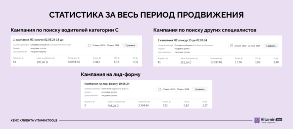 - Чтобы найти водителей, настроили рекламу по ключевым фразам: «работа свежие вакансии водитель категории С», «работа водителем категории С в компанию», «работа водителем категории С свежие», и «ищу работу водителем свежие вакансии». Учитывали запросы, сделанные за последние 14 — 30 дней, чтобы охватить наиболее активных соискателей.