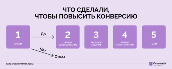 По итогам первого месяца заказчик дал обратную связь: конверсия из заявки в найм составила всего 2,5%. А нам нужно было достичь 5%.