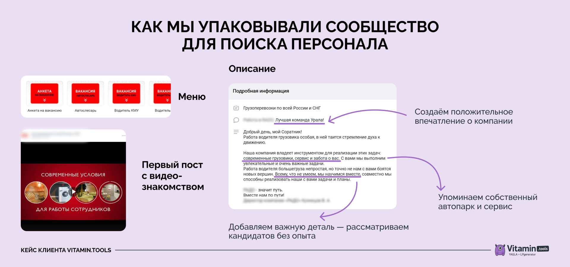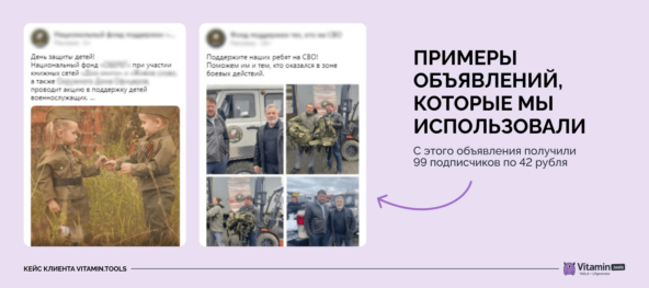 Переписку с менеджером заменили на анкету. Трафик вели на сообщество, в меню которого пользователь мог заполнить анкету и указать личные данные. Однако и здесь мы столкнулись с трудностями — пользователи неохотно делились данными. Модерация в VK обычно проходит быстро и занимает от одного часа до одного дня. На скорость влияет время запуска, содержание объявления и тематика. Чем позитивнее посыл и нейтральнее изображения, тем быстрее объявление одобрят. Однако, если тематика спорная, процесс может затянуться, так как менеджеры VK тщательно проверяют все сертификаты, дипломы и другие важные документы. Конечно, грузоперевозки не та ниша, где могут возникнуть проблемы. Но благотворительность, как раз такая. В кейсе, о котором я расскажу дальше, нам не пропустили объявления с фотографиями руководителей фонда. Оказалось, что VK не нашёл данные о владельцах и на всякий случай завернул объявления. Мы подгрузили нужные документы и только после этого прошли модерацию. Всех своих заказчиков мы ведём через рекламную экосистему Vitamin.tools, возвращающую до 18% от пополнения рекламы. И вот какой интересный факт я заметил. Объявления, размещённые через кабинеты Vitamin.tools, проходят модерацию значительно быстрее. Причём на всех проектах. И хотя пройти модерацию можно самостоятельно, я считаю, что в сложных случаях лучше обращаться за помощью к специалистам. Как вариант, можно зарегистрироваться в Vitamin.tools. Этап 3. Оптимизировать рекламную кампанию На втором месяце работы мы внесли изменения в кампанию: Однако, несмотря на эти изменения, по итогам второго месяца конверсия снизилась до 1,5%. Запуска лид-формы и сужения настроек по ГЕО оказалось недостаточно. Проблема была не в рекламе, а в нехватке менеджеров, обрабатывающих заявки. Результаты Над этим проектом работали два с половиной месяца. Бюджет на всю кампанию составил 41 000 рублей. Результат: 125 заявок, из которых 70 пришли, когда мы настраивали рекламу на Свердловскую область. Продвигать благотворительные организации через VK непросто. С одной стороны, модераторы строго относятся к фондам и тщательно проверяют все данные, чтобы исключить возможность мошенничества. С другой стороны, пользователи сами относятся к рекламе таких сообществ с недоверием, ведь в интернете много мошенников, фейковых фондов и ботов. Поэтому благотворительным организациям важно доказывать свою честность. Во-первых, нужно предоставлять модераторам все документы, подтверждающие легитимность фонда. Во-вторых, необходимо рассказывать подписчикам о своей деятельности, учредителях и обязательно публиковать отчеты о проделанной работе. Люди, которые помогают фонду, хотят видеть, куда идут их деньги и ощущать, что их вклад имеет значение. В этом проекте нашей задачей было не только настроить рекламу, но и помочь заказчику сформировать доверие у пользователей. Именно от уровня доверия зависело, сможет ли фонд собрать пожертвования. Поэтому мы одновременно работали над таргетированной рекламой и давали рекомендации по ведению сообщества. Этапы работы: 1 этап. Протестировать посадочные страницы Сначала запустили рекламу на сайт с детальным описанием деятельности фонда и настроенной системой сбора пожертвований. Потратили 9 000 рублей, но заявок не получили. Тогда решили перенаправить трафик на сообщество. Пробовали вести на с