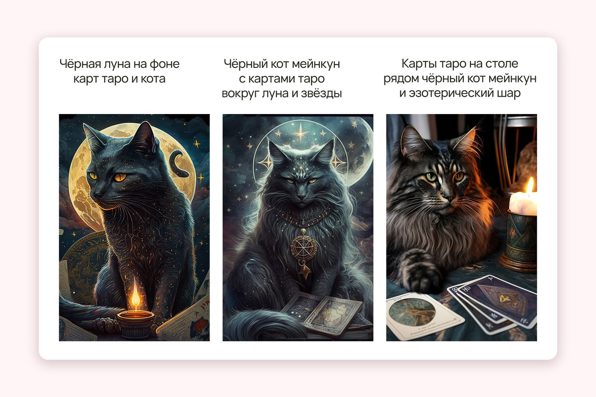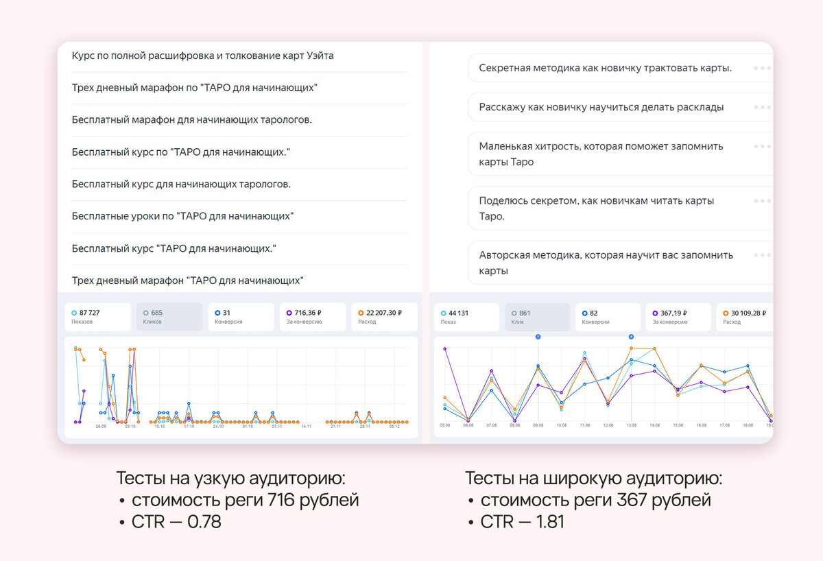 Первая проблема возникла при поиске аудитории. Тесты показали, что в нише таро не так много людей, которые хотят освоить профессию. Скорее, люди изучали таро для себя, в качестве хобби. Прямые заходы не сработали: «регистрируйся, купи, приходи на обучение, бесплатный курс, бесплатный марафон». А вот «секретные методики», «маленькая хитрость» и «авторская методика», наоборот, привлекли внимание. Используя такие фразы, мы предложили пользователям решить одну маленькую задачу — научиться читать значение карт. Для таро чтение карт — это реальная проблема, в интернете много разной информации. Поэтому кажется, что таро — это что-то сложное, что нужно учить годами, люди к этому не готовы. Крео с текстом «секретная методика», «авторская методика», «научись расшифровать истинное значение карт» до сих пор хорошо отрабатывает. Смысл получается таким, что люди после покупки курса узнают что-то тайное, чего не знают другие. Зарегистрировавшиеся — избранные, им раскроют секрет. Обычно большинство школ хотят сразу получить учеников, поэтому транслируют в рекламе: «Приходи к нам, мы тебя обучим профессии», а люди по факту еще не готовы. Они просто хотят узнать с помощью карт свою судьбу, а не освоить новую профессию. Эту мысль подтверждает статистика Яндекс Wordstat: запрос «таролог обучение» — меньше 600 показов в месяц, а просто «таро» — более пяти миллионов. Обычно в сфере онлайн-образования выстреливают креативы с фото спикера. Здесь же они вообще не сработали, как и картинки с фотостоков. Например, такие: В процессе поиска идей мы решили протестировать картинки, созданные нейросетью. Сгенерировали мистических чёрных котов и запустили тесты. Креативы стаботали: котиков и таинственное любят все. Картинки создавали с помощью Telegram-бота @RegensonBot по таким запросам: Кстати, здесь мы очень чётко попали в конкретный продукт — в то же время в другой школе эти котики не зашли вообще. Почему — сложно сказать, у нас целевая аудитория 25-55 лет, в той школе почти такая же — 35-55. Возможно, из-за того, что в той школе спикер — мужчина. Наиболее успешной оказалась связка: коты + «секретная методика». Мы работали только с Яндекс Директ. ВК — не зашёл, потому что соцсеть не любит тему эзотерики, плохо пропускает объявления. В Яндексе ситуация лучше, но не везде: Модерация. Обычно мы запускаем кампанию в Директе и ничего не банится, всё хорошо работает. Но могут возникнуть такие сложности: Хорошая окупаемость и возможность работать внутри самой рекламной кампании. Часто бывает, что пользователь перешёл с рекламы на сайт, заинтересовался, но отвлекся и не оставил заявку. Яндекс же зафиксировал переход, а значит мы можем запустить ретаргет и вернуть пользователя. Можно работать через Vitamin.tools, где есть удобный дашборд и собраны данные по всем рекламным кабинетам. А самое главное, через Vitamin.tools можно вернуть до 18% от суммы пополнения. На новогодние праздники я решила не отключать рекламу, хотя в сфере образования это постоянная практика. Считается, что в каникулы людям не до учебы. И неожиданно это показало очень хорошие результаты. Лид стоил 217 рублей. В Новый Год можно привлекать лиды в 2 раза дешевле по двум причинам: В итоге: почти за год работы окупаемость выросла более чем в три раза. С сентября заказчик потратил на рекламу 7 420 231 рубль — заработал около 26 000 000 рублей (это без