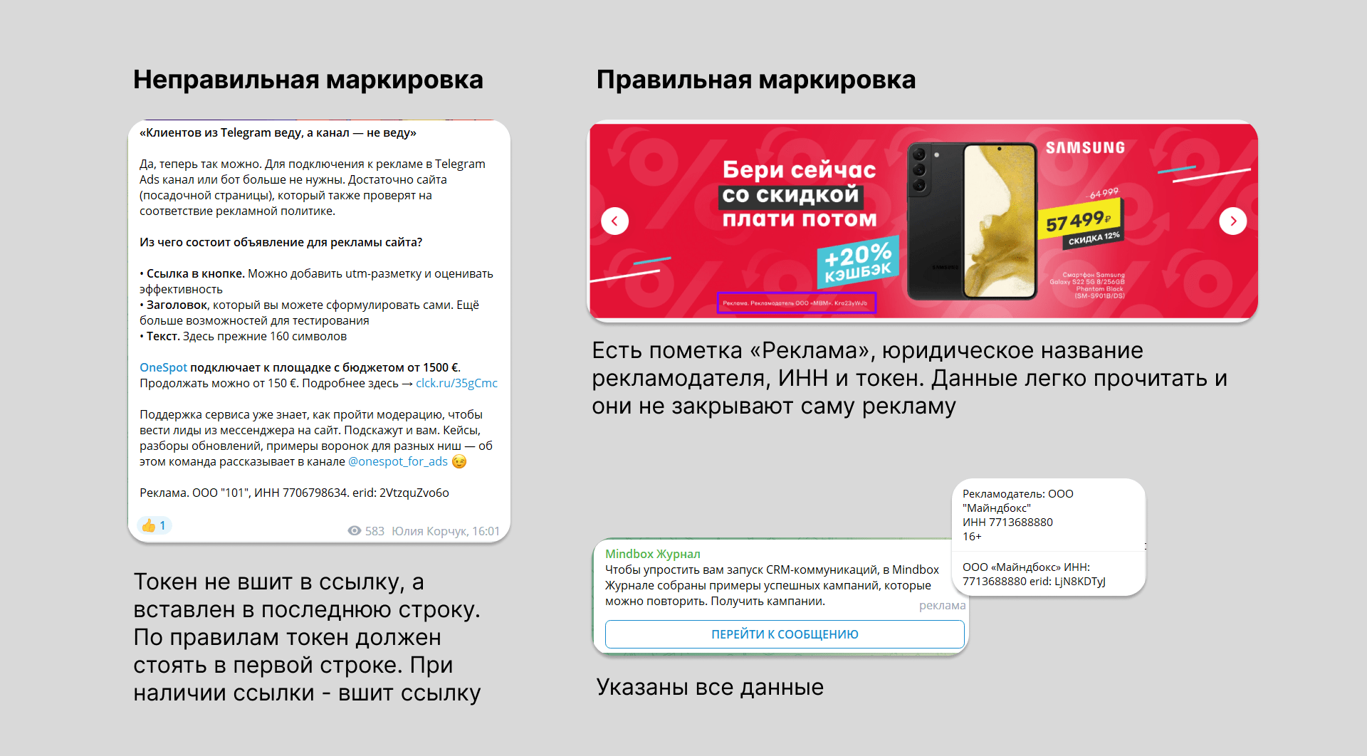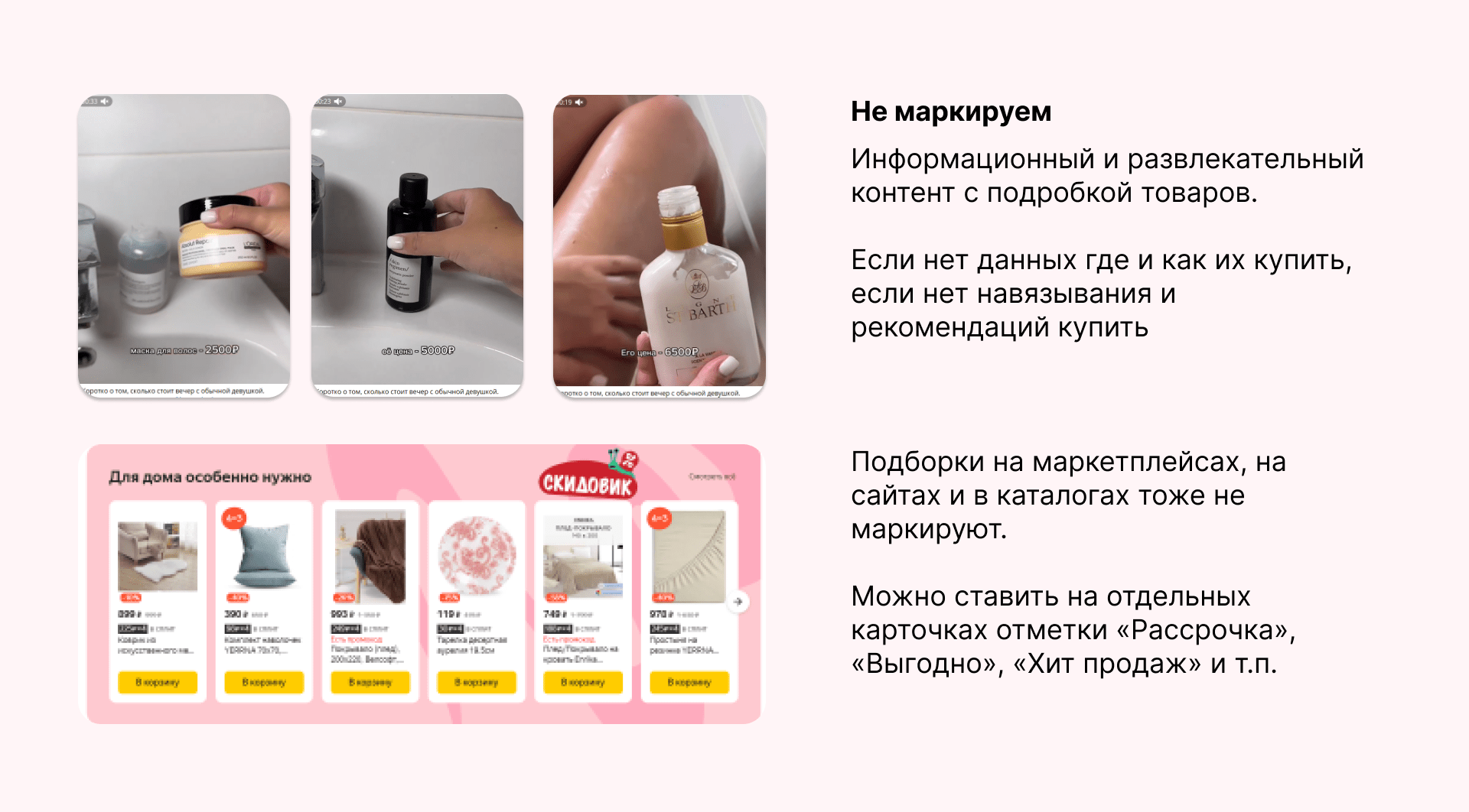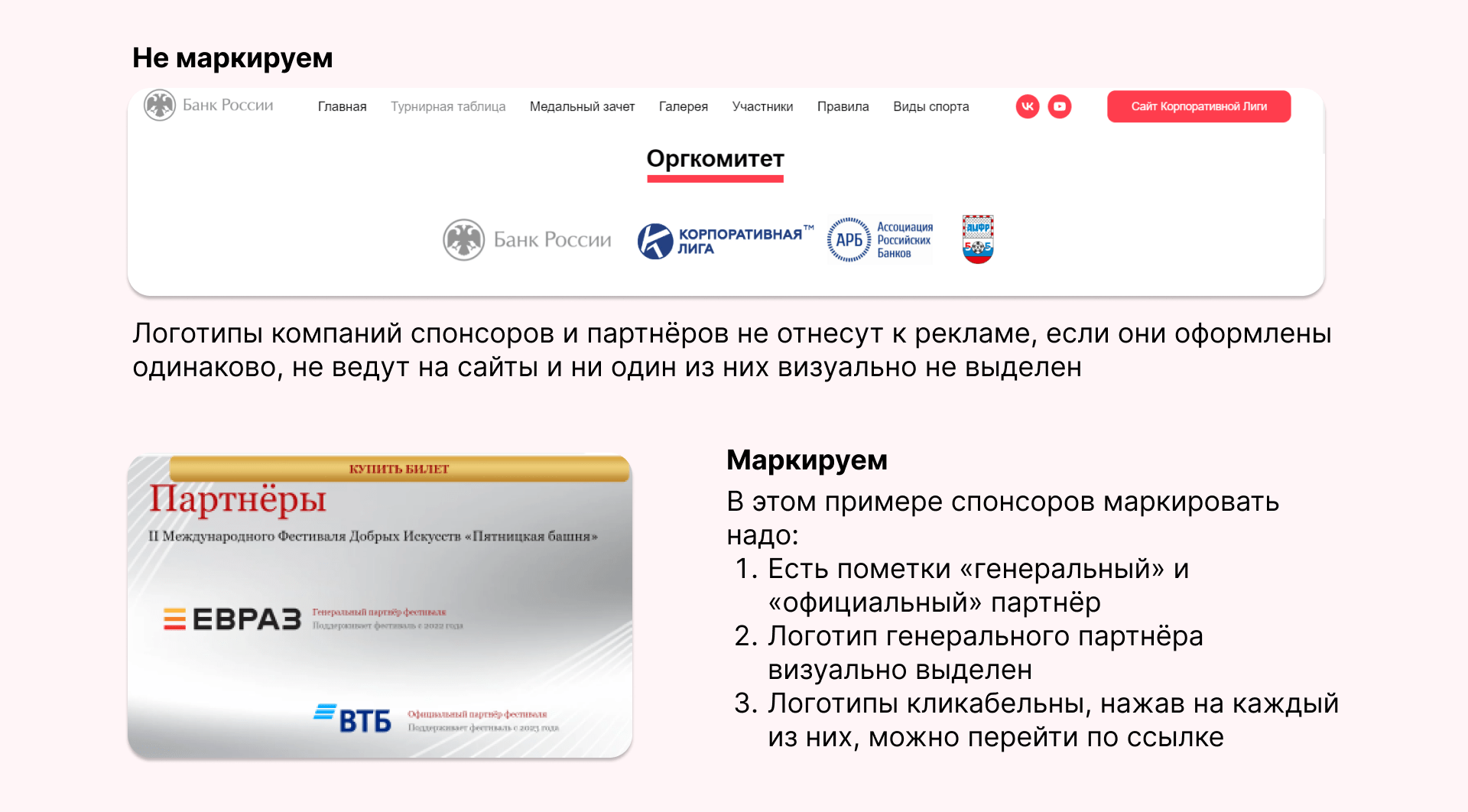 Вообще ФАС на все вопросы какой контент нужно и не нужно маркировать рекомендует отталкиваться от контекста и смотреть на ситуацию в целом. Фото товара без призыва «Купи» вполне могут посчитать за информационную картинку. ФАС разъясняет какой контент относят к рекламе, следит за наличием отметки «Реклама» и данных о рекламодателе. Он же при отсутствии этой информации штрафует рекламораспространителя (ч.1 ст. 14.3 КоАП РФ). Штраф для юрлиц — от 100 000 до 500 000 рублей. Первые открытые дела против Telegram-канала «Мой Нижний Новгород» касаются именно этой части маркировки. Канал постил рекламу без этой отметки. РКН же отслеживает токены и сдачу отчётов в ЕРИР. Здесь уже ответственность несёт рекламодатель, рекламораспространитель и рекламные системы (ч. 15-17 ст. 14.3 КоАП РФ). Если хотите запустить нативку без маркировки, ограничьтесь показом продукта в кадре без явно рекламных поз и личных рекомендаций. Самореклама. Такого термина в законе нет. Рекламой будет считаться любая информация, рассчитанная на неопределённую аудиторию и выложенная с коммерческой целью. Если вы хотите прорекламировать свой продукт в чужом блоге или паблике, расписать его преимущества, добавить CTA и ссылку для заказа, — пост нужно маркировать. Если вы ничего не продаёте, а хотите привлечь подписчиков в свой канал, — пост всё равно нужно маркировать. С точки зрения ФАС такой пост — реклама. Лендинги и квиз-лендинги даже если они рекламируют конкретный товар. Информационные посты о партнёрах и спонсорах. Раздел «Партнёры» и «Спонсоры» не нужно маркировать, если все компании представлены одинаково: Аналогично с постами и статьями. Маркировать не надо, если на одной странице указаны логотипы всех партнёров без каких-либо акцентов. Если же надо выделить генерального партнёра или выгодно преподнести его в отдельном посте, — делайте маркировку. Карточки товаров, подборки и товарные полки где все товары оформлены одинаково и никак визуально не выделены. Формат и площадка не играют роли, под исключение попадают видео, фото и текстовые подборки, если ни один из товаров не выделен. Нативный контент, где данные о продукте или производителе являются частью сюжета. Например, фуд-блогер может использовать продукт бренда, показать его в рекламе, но не акцентировать на нём внимание, и такой контент не посчитают рекламой. Но только в том случае, если он не упоминает и не расхваливает продукт. Ещё не маркируем: С 1 сентября 2022 года штрафуют за рекламу, опубликованную в сети без пометки «Реклама» и данных рекламодателя. Именно за эту часть маркировки ФАС может оштрафовать рекламораспространителя задним числом. С 1 сентября 2023 года Роскомнадзор штрафует за отсутствие токена и отчёта в ЕРИР. Этот штраф могут прислать рекламодателю, рекламораспространителю и посреднику. Причём штрафовать будут за отсутствие маркировки, за частичную или неправильную маркировку, и даже за передачу всех необходимых данных, но с нарушением сроков. Первое время рекламодателей будут проверять вручную или по поступившим запросам. Теоретически, любой человек, в том числе недобросовестный конкурент, может пожаловаться в РКН на неправильную маркировку, и если информация подтвердится, — всех участников цепочки оштрафуют. Маркировка состоит из двух этапов: непосредственно самой маркировки и передачи отчёт