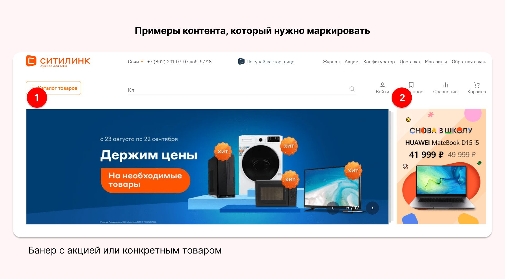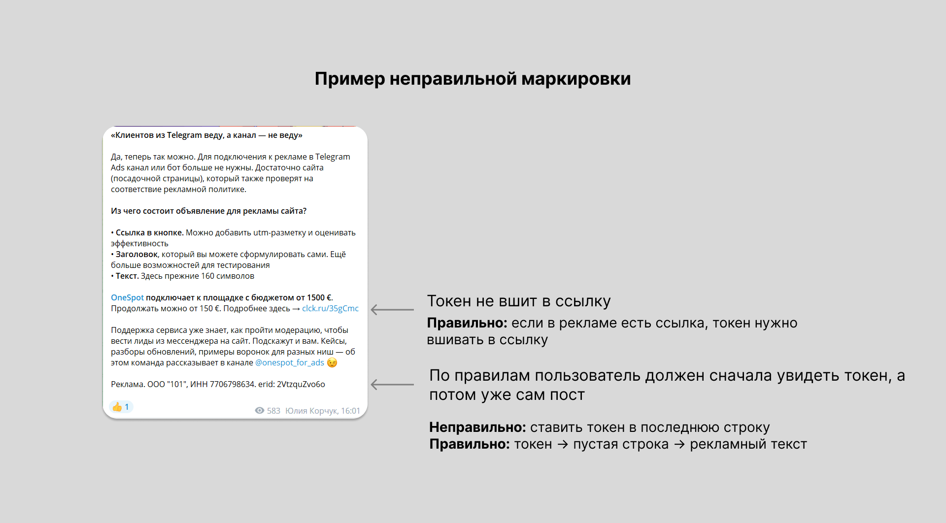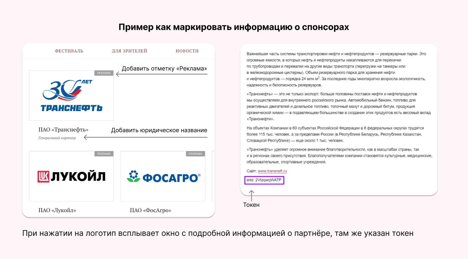 Вообще ФАС на все вопросы какой контент нужно и не нужно маркировать рекомендует отталкиваться от контекста и смотреть на ситуацию в целом. Фото товара без призыва «Купи» вполне могут посчитать за информационную картинку. ФАС разъясняет какой контент относят к рекламе, следит за наличием отметки «Реклама» и данных о рекламодателе. Он же при отсутствии этой информации штрафует рекламораспространителя (ч.1 ст. 14.3 КоАП РФ). Штраф для юрлиц — от 100 000 до 500 000 рублей. Первые открытые дела против Telegram-канала «Мой Нижний Новгород» касаются именно этой части маркировки. Канал постил рекламу без этой отметки. РКН же отслеживает токены и сдачу отчётов в ЕРИР. Здесь уже ответственность несёт рекламодатель, рекламораспространитель и рекламные системы (ч. 15-17 ст. 14.3 КоАП РФ). Если хотите запустить нативку без маркировки, ограничьтесь показом продукта в кадре без явно рекламных поз и личных рекомендаций. Самореклама. Такого термина в законе нет. Рекламой будет считаться любая информация, рассчитанная на неопределённую аудиторию и выложенная с коммерческой целью. Если вы хотите прорекламировать свой продукт в чужом блоге или паблике, расписать его преимущества, добавить CTA и ссылку для заказа, — пост нужно маркировать. Если вы ничего не продаёте, а хотите привлечь подписчиков в свой канал, — пост всё равно нужно маркировать. С точки зрения ФАС такой пост — реклама. Лендинги и квиз-лендинги даже если они рекламируют конкретный товар. Информационные посты о партнёрах и спонсорах. Раздел «Партнёры» и «Спонсоры» не нужно маркировать, если все компании представлены одинаково: Аналогично с постами и статьями. Маркировать не надо, если на одной странице указаны логотипы всех партнёров без каких-либо акцентов. Если же надо выделить генерального партнёра или выгодно преподнести его в отдельном посте, — делайте маркировку. Карточки товаров, подборки и товарные полки где все товары оформлены одинаково и никак визуально не выделены. Формат и площадка не играют роли, под исключение попадают видео, фото и текстовые подборки, если ни один из товаров не выделен. Нативный контент, где данные о продукте или производителе являются частью сюжета. Например, фуд-блогер может использовать продукт бренда, показать его в рекламе, но не акцентировать на нём внимание, и такой контент не посчитают рекламой. Но только в том случае, если он не упоминает и не расхваливает продукт. Ещё не маркируем: С 1 сентября 2022 года штрафуют за рекламу, опубликованную в сети без пометки «Реклама» и данных рекламодателя. Именно за эту часть маркировки ФАС может оштрафовать рекламораспространителя задним числом. С 1 сентября 2023 года Роскомнадзор штрафует за отсутствие токена и отчёта в ЕРИР. Этот штраф могут прислать рекламодателю, рекламораспространителю и посреднику. Причём штрафовать будут за отсутствие маркировки, за частичную или неправильную маркировку, и даже за передачу всех необходимых данных, но с нарушением сроков. Первое время рекламодателей будут проверять вручную или по поступившим запросам. Теоретически, любой человек, в том числе недобросовестный конкурент, может пожаловаться в РКН на неправильную маркировку, и если информация подтвердится, — всех участников цепочки оштрафуют. Маркировка состоит из двух этапов: непосредственно самой маркировки и передачи отчёт
