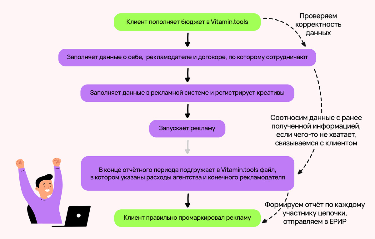 Самая простая цепочка подойдёт тем у кого Vitamin-кабинет пополняет конечный рекламодатель, а не посредник. Для автоматизации маркировки вам нужно корректно указать данные конечного рекламодателя в рекламном кабинете и в интерфейсе Vitamin.tools. Всё остальное мы сделаем за вас