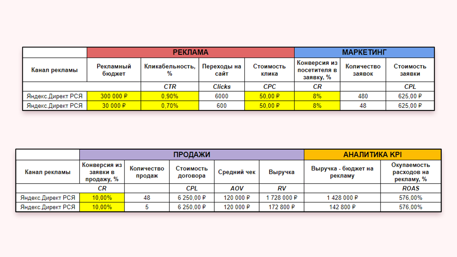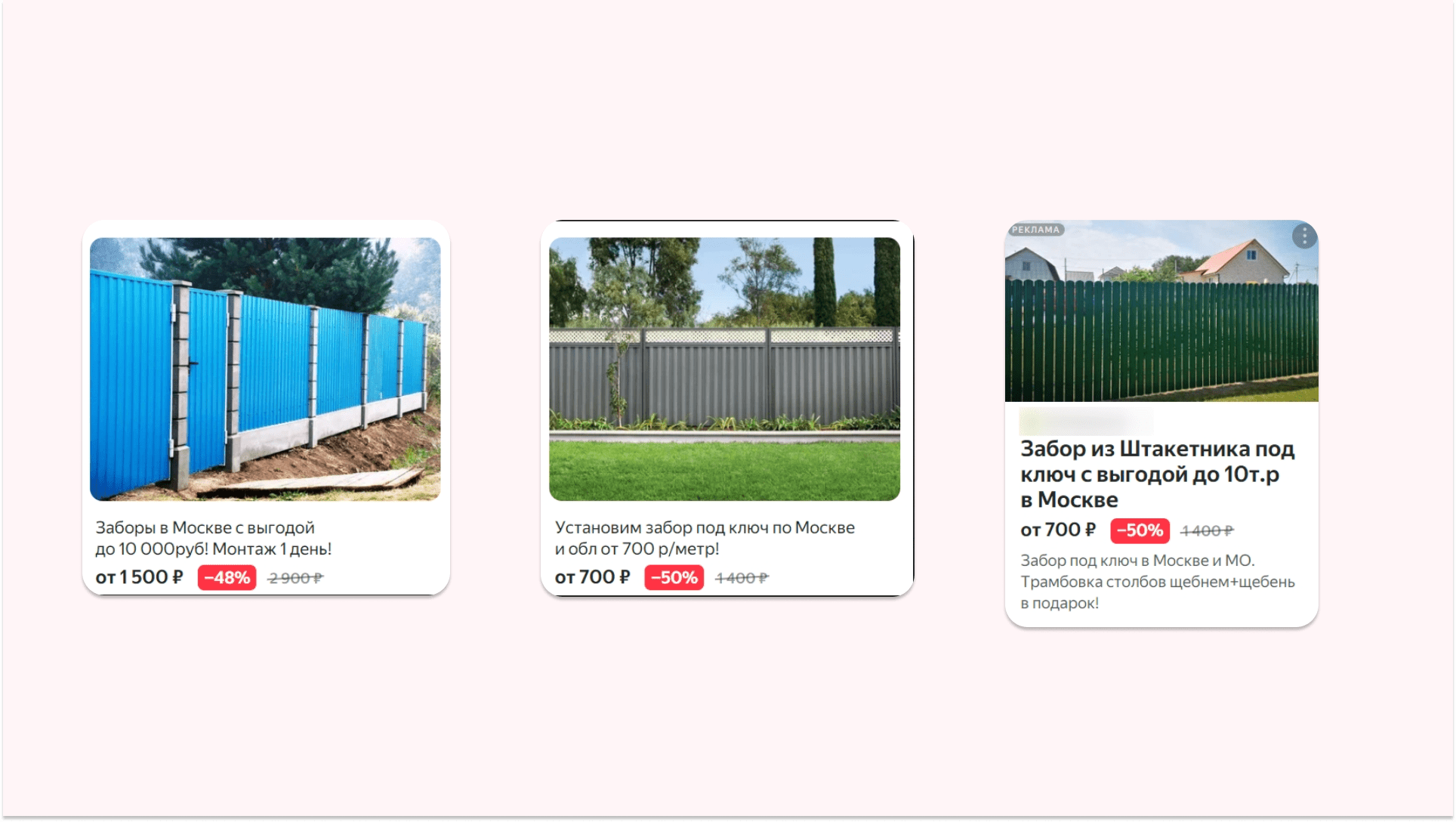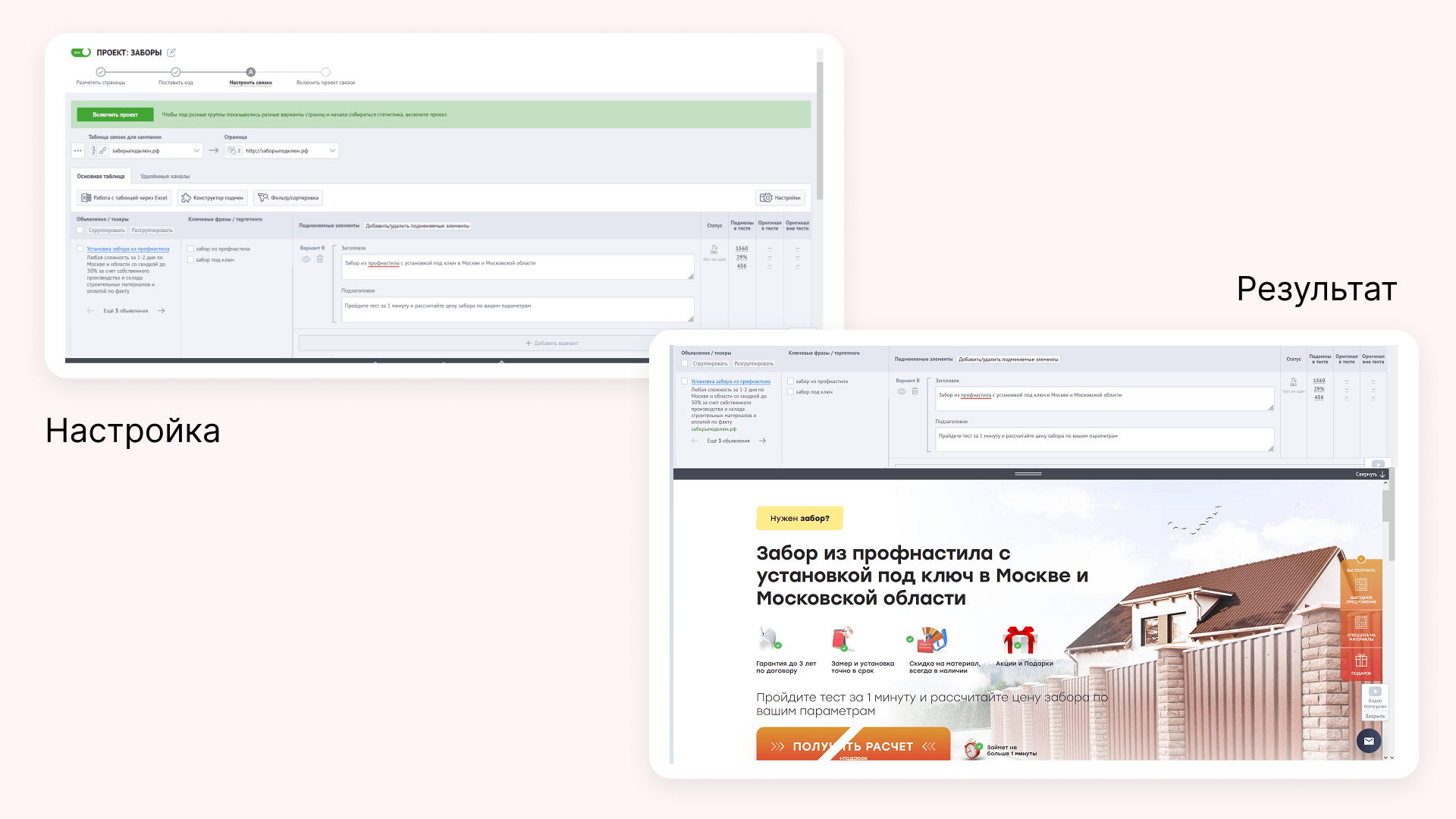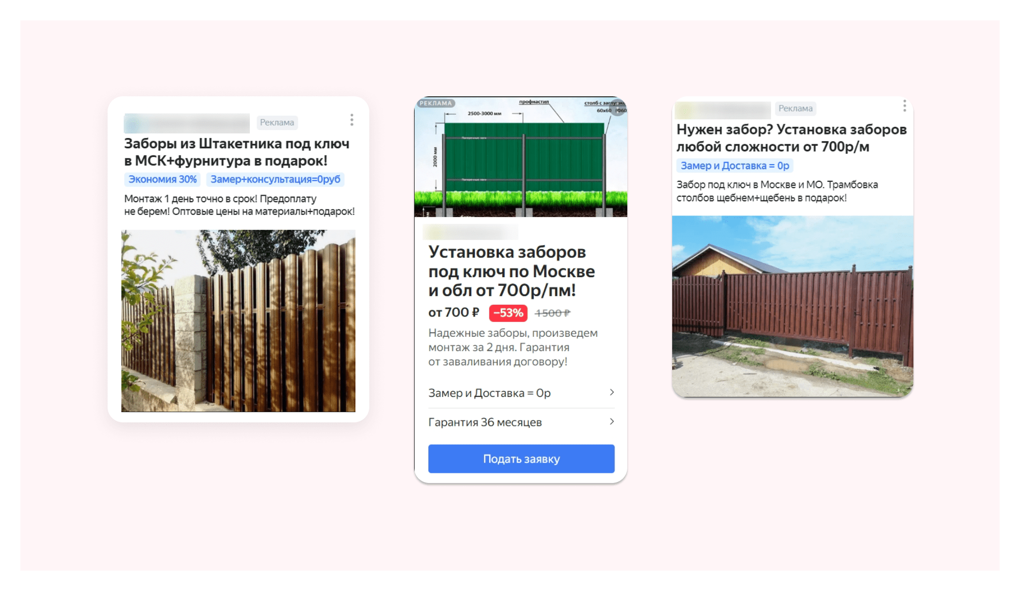 Ключевые цифры для владельца бизнеса — прибыль и окупаемость с рекламы. Так как я работаю с нишей не первый год, я знаю средние цифры по рынку и могу спрогнозировать результат ещё до размещения. У большинства заказчиков нет встроенной CRM-системы, поэтому конверсию из заявки в продажу могу посчитать только примерно — около 10%, но по факту может быть выше. Вообще, если вы хотите максимально эффективно продвигаться и получать конверсию в 2 раза выше, настраивайте связку CRM+сквозная аналитика. За несколько лет работы в этой нише я вывел оптимальную структуру сайта, которая даст максимальную конверсию. В лендингах это всегда: В квизах — самое главное оффер и форма заявки. Чем проще и понятнее форма, тем выше у неё будет конверсия. Пример квиза: Группирую поисковые запросы по типам забора: Часто добавляю ещё один сегмент — общий. Он ведёт на страницу лендинга со всеми типами забора. Эта реклама привлекает на людей, которые пока не знают чего хотят и только прицениваются, то есть на холодную аудиторию. Им важно посмотреть выполненные проекты, понять чем предложение заказчика отличается от всего что представлено на рынке, и, конечно, важно узнать цену. Чтобы получить необходимое количество заявок как можно быстрее, я делаю два домена и под каждый тип забора создаю отдельный квиз: общий, профнастил, евроштакетник, рабица, 3Д сетка. Под один проект я могу создавать по 10 квизов. Чтобы не делать под каждую услугу отдельный квиз, можно подключить инструмент Гиперсегментация от Vitamin.tools. Он сделает подмены контента автоматически. Далее настраиваю Мастер Кампаний РСЯ и создаю объявления для каждой группы объявлений: Я не делаю A/B-тесты, просто запускаю рекламу и тестирую разные типы объявлений. Если заявок мало или цена лида высокая, — отключаю и тестирую новые заходы. Статистика за июнь по одному из рекламных кабинетов: Самый популярный забор — забор из профнастила. С рекламы приходит больше всего заявок, остальные сегменты работают плюс-минус одинаково. Разница только в цене: заявка на забор из евроштакетника выходит в районе 800 рублей, а заявка на забор из профнастила — 400 рублей. Со всех каналов приходят целевые запросы без ботов и фродов. Все пользователи, перешедшие с рекламы на сайт и оставившие заявку, хотят купить забор. Разница в сроках: одним нужно сделать сразу же, другим — к концу сезона. Максимальный срок возврата покупателя — 6 месяцев. Результаты по одной рекламной кампании: Ни у одного из этих заказчиков не было настроенной CRM, они не хотели её ставить, так как не были уверены, что она что-то изменит. Поэтому целевые и нецелевые лиды пришлось помечать вручную. Заявок за всё время: 6019 Звонков за всё время: 20% от заявок Средняя стоимость заявки: 585 рублей Средняя конверсия в договор: 10%, а возможно и выше Всё в рамках плана. Напомню, что заказчики просят обеспечить им стабильный поток заявок — обращений от людей, которым нужен забор. В этом случае план был по 30 заявок в день. Расход по всем клиентам ~ 5 661 000 руб с НДС Расход в месяц ~ 850 000 руб Создано и протестировано рекламных кампаний ~ 328 шт Заявок получено (без учета звонков и мессенджеров) ~ 9013 шт Заявок в месяц ~ 1300 шт Звонков всего получено ~ 20% от заявок это ~ 1800 шт Средняя стоимость заявки ~ 630 р с НДС Средняя конверсия в договор ~ 10%