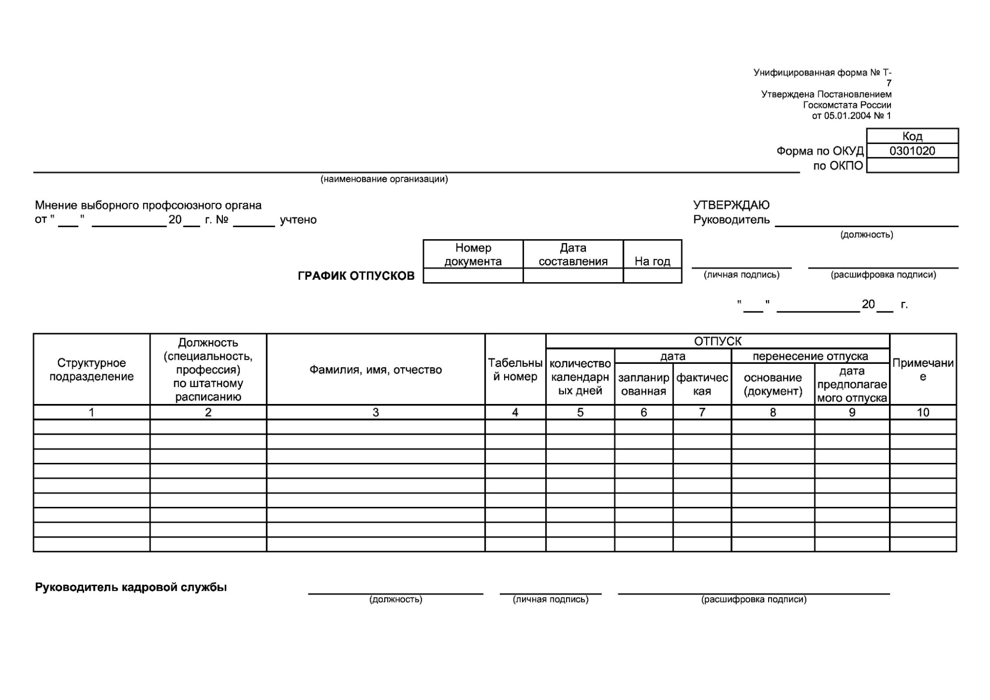 Когда все заявки собраны, кадровая служба приступает к оформлению документа. Чаще всего используется привычная форма Т-7, утверждённая постановлением Госкомстата РФ № 1 от 05.01.2004. Большинство компаний все еще использует этот классический шаблон, но можно применять и собственные формы, главное внести в них все обязательные данные.