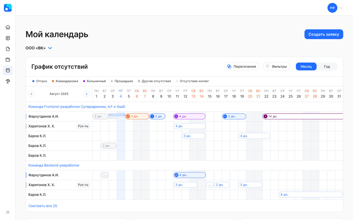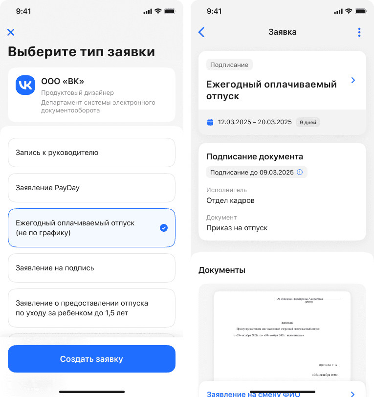 - заявления на отпуск (по графику и вне графика),