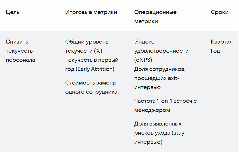 Метрики должны измерять конкретное изменение, ради которого запускается проект. Если цель — снизить текучесть новичков, метрика — процент увольнений в первые 3-6 месяцев, а не общая удовлетворенность компанией.
