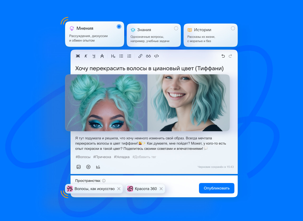 Мнения используются для обсуждений и обмена опытом, Знания — для вопросов, имеющих однозначный ответ, а Истории — для публикации больших статей и описания личных впечатлений. К постам с полноценной текстовой разметкой пользователи могут прикреплять фото, видео и опросы.