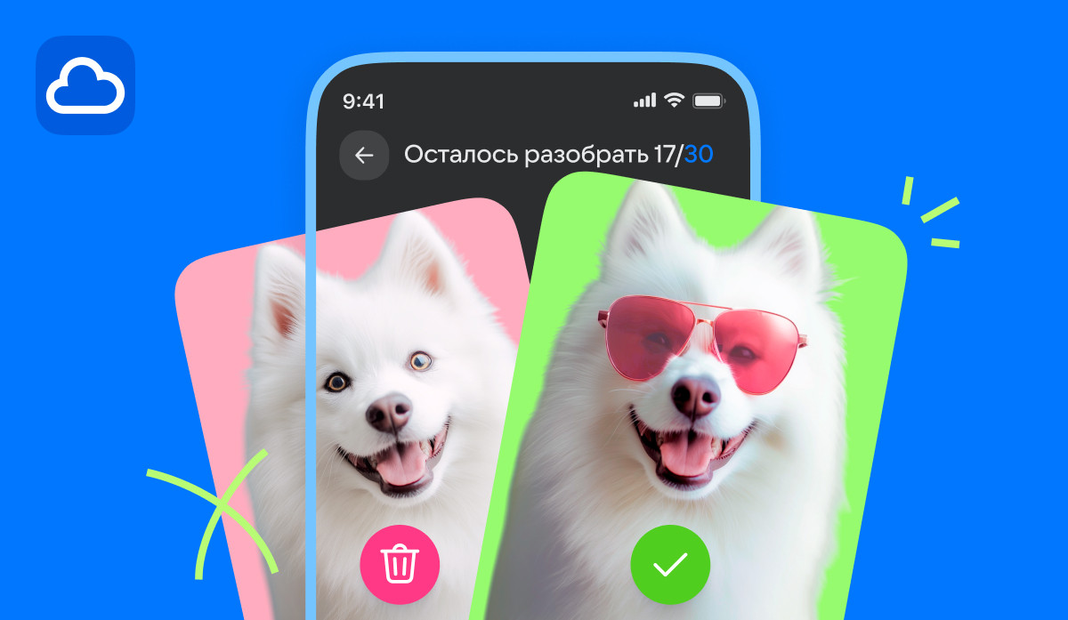 При включении функции «Разобрать фото» каждая фотография отображается в виде карточки с управлением жестами . Это позволяет легко и быстро удалять ненужные файлы. Достаточно смахнуть фото свайпом влево, чтобы отправить файл в корзину, или вправо, чтоб перейти к следующему снимку. Все отмеченные для удаления фото сразу перемещаются в «Корзину» в облачном хранилище, а удаление с устройства остаётся на усмотрение пользователя. Такой формат помогает быстро навести порядок в галерее Облака и мобильного устройства.
