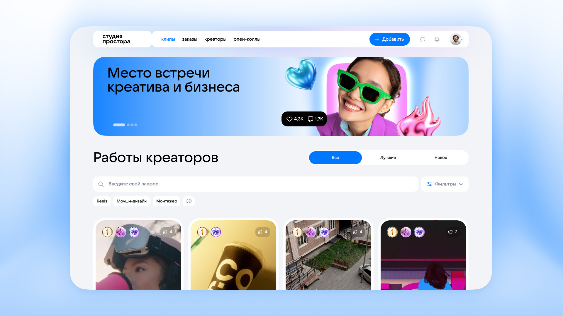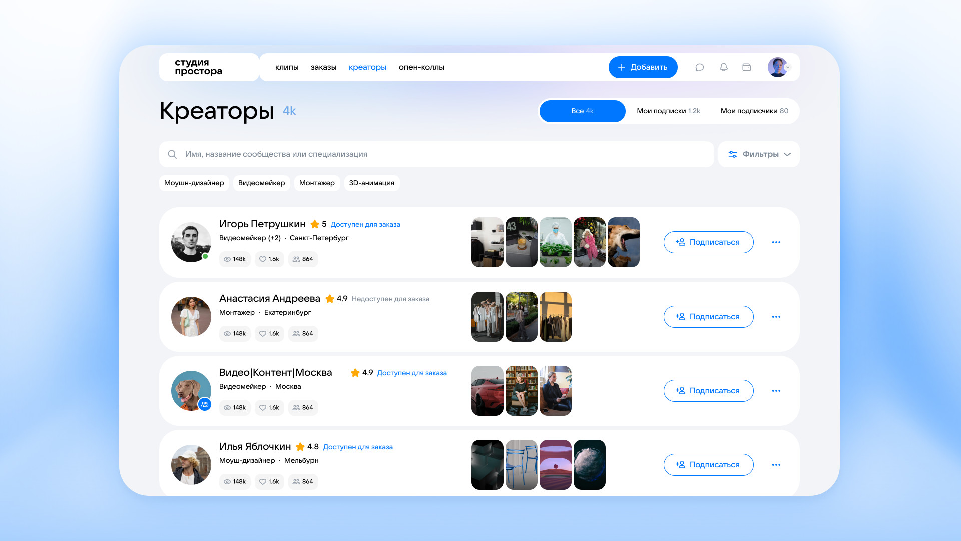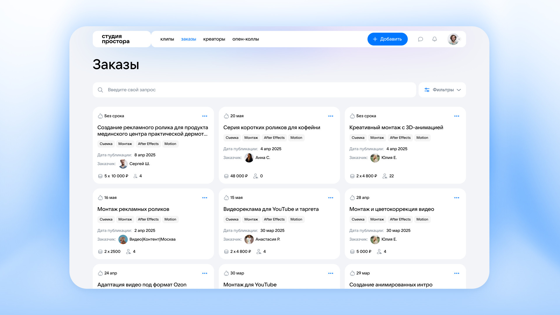 В веб-версии Студии Простора стал доступен функционал заказа и размещения видеоконтента — он позволяет выбирать креаторов по специализации, лайкам, просмотрам портфолио и рейтингу. Также можно подписаться на автора, чтобы связаться с ним позже. С помощью сервиса заказчики получают готовый видеоконтент — ролики и визуальные материалы можно использовать без ограничений в своих сообществах, на маркетплейсах или в рекламе. Благодаря функционалу безопасной сделки в сервисе налажено надежное и прозрачное взаимодействие исполнителей и заказчиков — оплата поступает креатору после выполнения и подтверждения заказа.