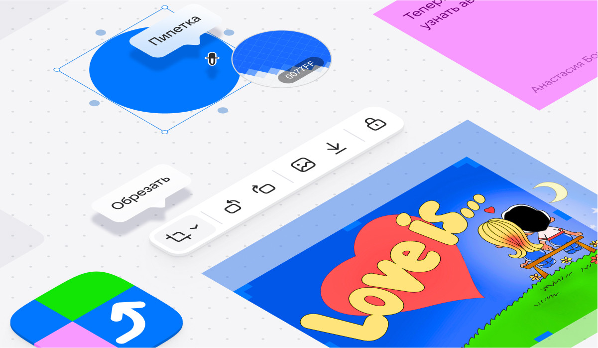 В цветовой палитре появилась настройка прозрачности для фигур, а с помощью инструмента «Пипетка» можно копировать цвет с любого элемента в виртуальном пространстве и применять его к другим объектам. Это, например, позволит создать уникальный проект в корпоративных цветах.