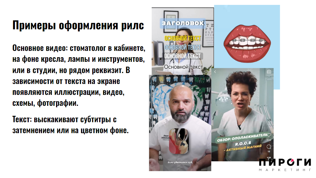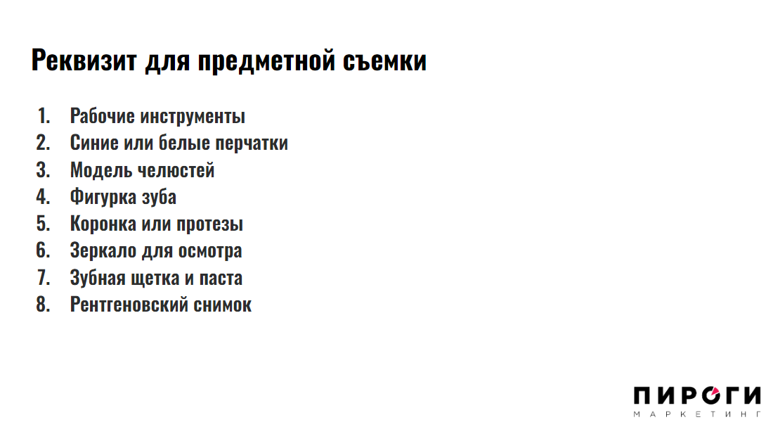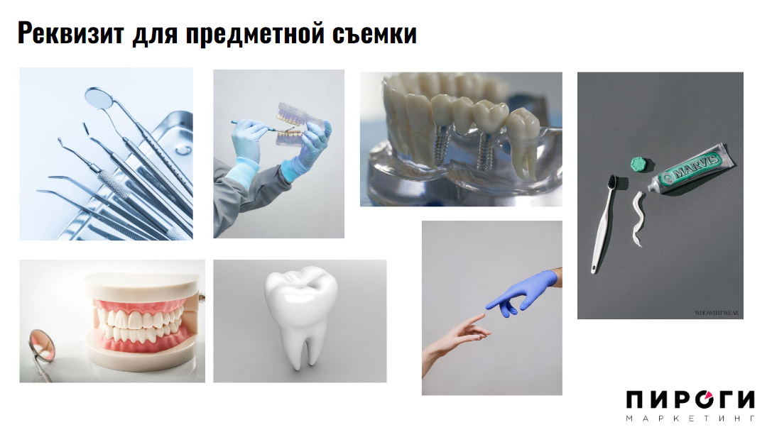 Мы понимаем, что избавиться от профдеформации сложно: врачам не кажутся пугающими бормашина, острые предметы, импланты, ввинчивающиеся в десну. Но нужно думать о вашем клиенте или пациенте: за чем он идет к вам? Не за тем, чтобы ему установили имплант. Он идет за красивой улыбкой, за тем, чтобы ему было комфортно жевать, чтобы жить долго и с удовольствием, в конечном счете. У косметологов часто видим перебор с иглами, показана вся «кухня»: инъекции, припухлости, шприцы. Лучше показывайте «до» и «после» и результаты ваших услуг. Обращайте внимание, где используются горизонтальные фото, а где вертикальные. Каких вам понадобится больше. Сопоставляем контент-план и референсы. В один файл (мы обычно работаем в презентациях) складываете то, что вам понравилось. 1-2 страницы — одна тема. Вот как делаем мы в агентстве: Затем продумываем, какой потребуется реквизит: Обычно получается достаточно объемный документ, в котором прописаны: В помощь вам: сделайте несколько фото, которые вам точно пригодятся: Не забудьте про видео: Напишите слово «МУДБОРД» нам на почту info@vottakie.com, мы пришлем вам мудборд для стоматологической клиники. Идете к фотографу, который вам нравится, и показываете мудборд: что он скажет? Получится это осуществить? Фотографы любят работать по мудбордам. По нашему опыту, им скорее сложно, когда клиент пришел и стоит в ожидании, что фотограф как-то поставит их, придумает сюжет для съемки. Договорились, проконсультировались, добавили идеи. Распечатайте мудборд и можно приступать к фотосессии. Отработайте по максимуму все, что вы спланировали. За 2 часа получается от 500 фотографий, когда процесс не стопорится из-за отсутствия идей. Еще лучше, когда есть кто-то, кто сделает всю подготовительную работу за вас. Вам остается только отсмотреть стратегию, контент-план, внести свои правки, подготовиться к съемке и следовать мудборду, который агентство «ПИРОГИ» сделают для вас. Сейчас мы всю работу делаем за клиента и вместе с клиентом удаленно: стратегии обсуждаем на созвонах, готовим документы и согласуем их, сами отсматриваем конкурентов, сами формируем план по фотоконтенту. У нас даже есть возможность отсматривать результаты съемки в режиме реального времени и скорректировать фотографа, если он уйдет не туда. Мы получаем фото в тот момент, когда оно сделано. Поэтому можно написать нам вне зависимости от того, из какого вы города. Вот и все. Звучит, как план. Готовы сделать это за вас. В конце концов, каждый должен заниматься своим делом. Заполните короткую анкету, мы посчитаем, сколько будет стоить продвижение вашей стоматологии.