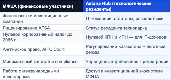 Финансовые услуги — это ядро МФЦА. Именно под них создавался центр, именно здесь регуляторная среда наиболее проработана. Если вы строите инвестиционную компанию, управляющий фонд, платёжный сервис или финтех — МФЦА стоит рассматривать в первую очередь. Какие виды деятельности лицензирует AFSA Вот основные категории лицензий, которые выдаёт регулятор: Что важно понимать про лицензирование в МФЦА Первое: граница между лицензируемой и нелицензируемой деятельностью определяется не названием услуги, а фактической моделью работы. Это принципиальный момент, который многие недооценивают. Например, грань между Managing Investments (управление — лицензируется) и Advising on Investments (консультирование — тоже лицензируется, но с меньшими требованиями) определяется одним критерием: есть ли у вас дискреция — право принимать инвестиционные решения без согласования каждой сделки с клиентом. Если клиент передал вам такое право — это уже Managing Investments. Подробнее об этом — в нашем материале о Managing Investments в МФЦА. Здесь начинается часть, которая интересна именно IT-аудитории Spark. МФЦА — это не только финансовые лицензии. Внутри центра работает Astana Hub — технологический парк, ориентированный на стартапы, IT-компании и технологические проекты. Что такое Astana Hub Astana Hub — это акселератор и технопарк, резиденты которого получают налоговые льготы, доступ к инфраструктуре и — что важно — возможность работать в связке с финансовой экосистемой МФЦА. Зачем IT-компании идти в МФЦА / Astana Hub Вот три реальные причины, которые мы слышим от клиентов: 1. Налоговая оптимизация для международного бизнеса. Если у вас IT-продукт с международной выручкой — нулевой корпоративный налог существенно меняет экономику бизнеса. При этом Казахстан не является офшором в классическом смысле: это страна с реальными DTT (соглашениями об избежании двойного налогообложения) с большинством государств. 2. Финтех и AI-проекты: регуляторный sandbox. МФЦА запустил FinTech Lab — регуляторную песочницу, где можно тестировать финансовые и AI-продукты без полного лицензирования. Это особенно актуально для проектов на стыке AI и финансовых услуг: robo-advisors, AI-скоринг, алгоритмическая торговля. 3. Структура для привлечения международного капитала. Инвесторы из Европы, Ближнего Востока и Азии хотят вкладывать в понятные структуры с предсказуемым правопорядком. МФЦА с английским правом и независимым судом — это история, которую можно рассказывать инвесторам без длинных объяснений. Важный нюанс: МФЦА и Astana Hub — разные юридические режимы с разными требованиями и льготами. Не все IT-компании автоматически получают доступ к финансовым инструментам МФЦА. Оптимальная структура зависит от модели бизнеса, источников дохода и целей по привлечению капитала. Если вы разрабатываете IT-продукт и думаете о структуре — рекомендую изучить раздел про Астана Хаб Третий сценарий использования МФЦА — и, пожалуй, наименее очевидный для широкой аудитории — это холдинги. Те, кто строит международный бизнес с несколькими операционными компаниями в разных странах, рано или поздно задаются вопросом: где разместить головную структуру? Почему МФЦА рассматривается как холдинговая юрисдикция Вот логика, которую мы объясняем клиентам: Когда МФЦА как холдинг имеет смысл — а когда нет Если коротко — вот наш практический ответ на вопрос «стоит ли и