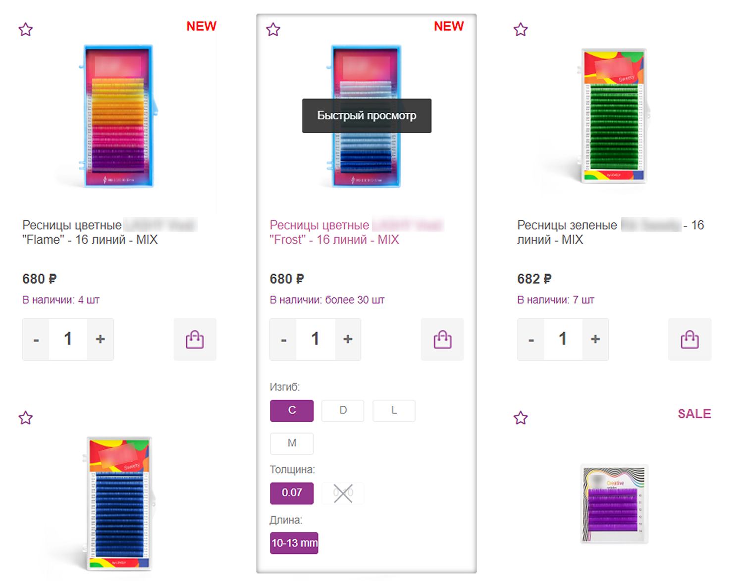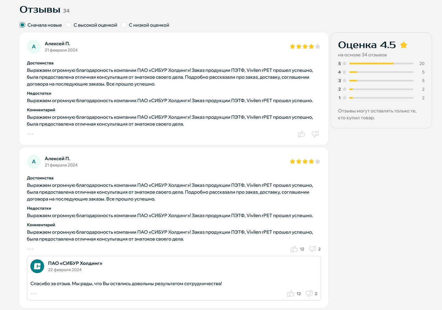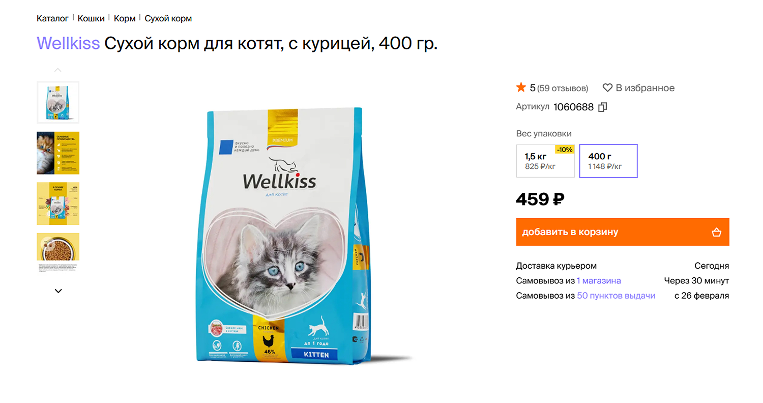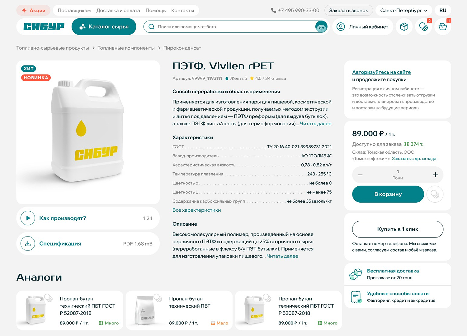 Например, вместо «Сухой корм» лучше прописать: «Сухой корм для котят, с курицей, 400 гр.». Если название товара получается слишком длинным, предупредите дизайнеров, чтобы блок отображался корректно. Качественные изображения — залог успешных продаж. Фотографии должны быть высокого разрешения, отображать товар с разных ракурсов и включать примеры его использования, чтобы помочь клиенту представить, как продукт будет выглядеть в реальной жизни. Видеоконтент в карточке товара позволит продемонстрировать продукт в действии, наглядно показать его преимущества, функциональность и особенности использования. Позвольте пользователям детально рассмотреть товар, реализовав функцию увеличения изображения при наведении курсора. Это улучшит пользовательский опыт и повысит уровень доверия к продукту. Это позволит ознакомить пользователей с основными характеристиками без перехода на отдельную страницу. Включите в превью изображение, цену, наличие и ключевые параметры. Это особенно полезно в каталогах с большим ассортиментом. Подробное описание товара — ключевая часть карточки, дающая представление не только о внешнем виде продукта, но и о его технических характеристиках и составе. Важно не просто перечислить характеристики, материалы, размеры и функциональные возможности, а вызывать эмоции, показывая, как продукт решает задачи покупателя. Для компании Сибур, работающей с B2B-аудиторией, мы сделали акцент на технических характеристиках. Фотографии товара служат дополнением к тексту, но не приоритетны для B2B-клиентов. Разделили пространство на три зоны: фотография товара, контент с описанием и характеристиками, а также блок для добавления товара в корзину. Более детальную информацию о проекте можно найти в нашем блоге. Используйте всплывающие подсказки, когда применяете сложные значения в описании. Это поможет удержать клиента на сайте, избавив его от необходимости искать разъяснения в других источниках. Кроме того, такие подсказки улучшат навигацию. Укажите параметры, которые помогают сделать осознанный выбор. Например, материалы, размеры, мощность, объем и т.д. Выводите ключевые технические параметры на первый экран, дополняя ссылкой на полный перечень. Чтобы покупателям было проще сравнивать товары, придерживайтесь единого формата характеристик, особенно если работаете с разными поставщиками. Для удобства восприятия структурируйте информацию по категориям и используйте элементы дизайна, повышающие читаемость, например, чередование цветов или графические блоки. Артикул — это уникальный идентификатор, который облегчает поиск приглянувшегося товара и его сравнение с аналогами. Для B2B это особенно удобно, так как оптовые покупатели часто приходят за конкретной позицией и могут быстро найти нужный товар по артикулу, без лишних поисков и уточнений. Пример расположения артикула — на изображении выше. Четко обозначьте цену и отобразите актуальное наличие товара. Если товар временно отсутствует, предложите подписаться на товар и обязательно сообщите о его поступлении. Если товар продается со скидкой, указывайте не только актуальную цену, но и первоначальную стоимость, а также размер выгоды. Дополнительно выделите скидку, например, с помощью заметного значка SALE, чтобы привлечь внимание покупателей и подчеркнуть выгодно
