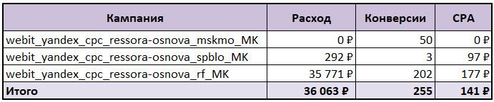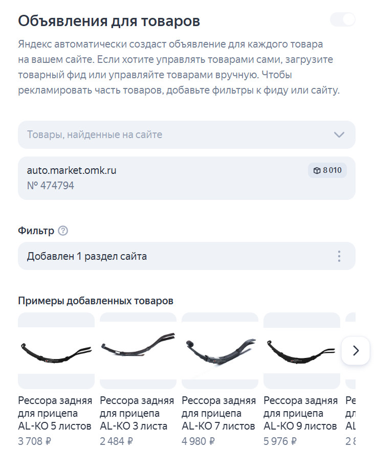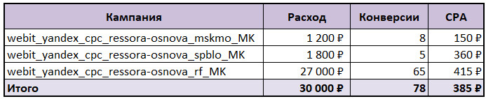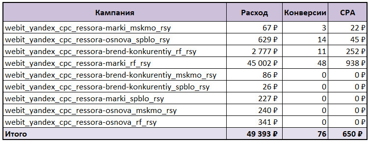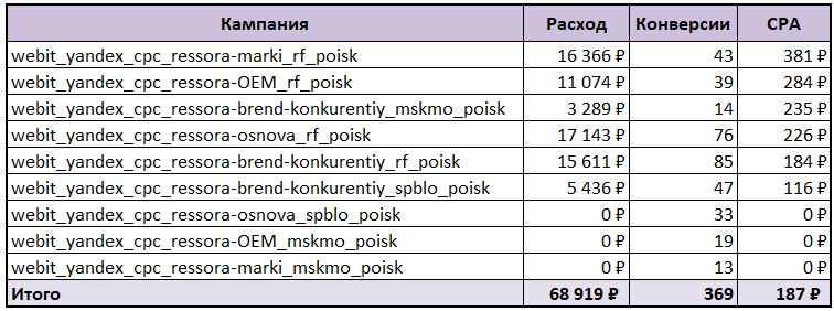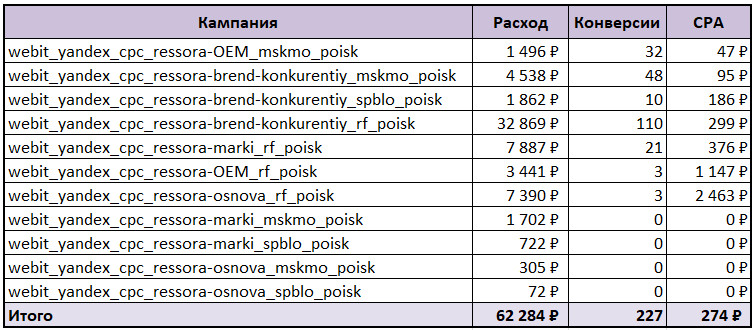 По каждому типу кампаний выделили семантику по брендово-конкурентным запросам, общим запросам по рессорам, рессорам OEM и маркам. На каждое направление семантики запустили отдельные кампании по региону показов: на Москву и область, Санкт-Петербург и Ленинградскую область, остальные регионы России.