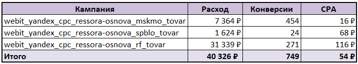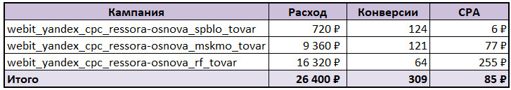 Конверсионный мониторинг показал, что поисковые кампании отрабатывают гораздо эффективнее, чем кампании в РСЯ. В октябре с поисковых кампаний пришло 227 целевых конверсий по 274 руб., был оформлен 61 заказ по стоимости 1021 руб. Конверсия из корзины в заказ составила 43%. Для сравнения, с кампаний в Сети пришло 76 целевых конверсий, но бОльшее количество пришлось на действие «добавление в корзину». Специалисты решили отключить кампании в Сети и сконцентрироваться на Поиске. Снижаем стоимость за действие в поисковой кампании За гипотезу приняли утверждение, что CPA (стоимость целевого действия) снизится, если объединить типы кампании по схожей семантике и расширить географию на всю Россию. Расширив географию в поисковых кампаниях, в мае мы увеличили количество конверсий на 63% и снизили стоимость общего CPA на 32%, а по оформленному заказу — на 36%. Мастер кампаний: как расширение географии увеличило конверсии В октябре Мастер кампаний принес 78 целевых конверсий по стоимости 385 руб., 12 заказов было оформлено с CPA 2500 руб. Целью отдела рекламы Webit стало увеличение количества конверсий и снижение стоимости общего CPA, а также CPA по оформленному заказу. Следуя гипотезе, в Мастере кампаний мы расширили географию на территорию России, вернули Москву и область. Это увеличило количество конверсий и снизило стоимость CPA по оформленному заказу примерно в 3 раза. Товарные кампании: как мы тестировали автоматическое добавление товаров в фид Клиент не мог предоставить фид для товарной кампании, а создавать фид с ручным добавлением товаров было бы слишком трудозатратно из-за огромного ассортимента товаров в интернет-магазине. На этом этапе решили протестировать добавление в РК товаров, найденных на сайте. Этот способ помог получить с товарных кампаний 749 целевых конверсий, из которых оформили 82 заказа. Мы перенаправили большую часть бюджета на товарную кампанию на всю РФ, снизив стоимость общего CPA примерно на 55%, а также CPA по оформленному заказу на 62%. Параллельно специалисты занимались оптимизацией кампаний: Такая детальная оптимизация позволяет держать процент отказов в приемлемых значениях до 20-30%. На старте проекта стоимость конверсии составляла 241 руб. Специалисты отдела рекламы протестировали различные типы кампаний и выявили, что работает именно на этом проекте. Увеличили бюджет на эффективные кампании, а малоэффективные отключили. Тщательно проработали кампании. В итоге стоимость целевой конверсии удалось снизить на 58% до 101 руб. CPA по оформленному заказу снизили на 42% до 598 руб.
