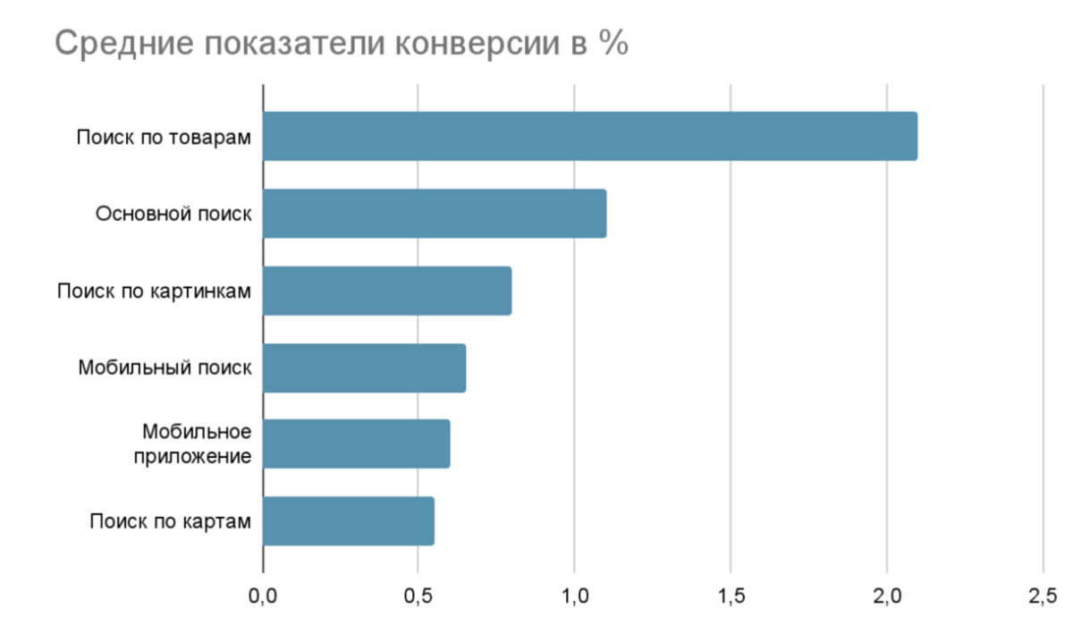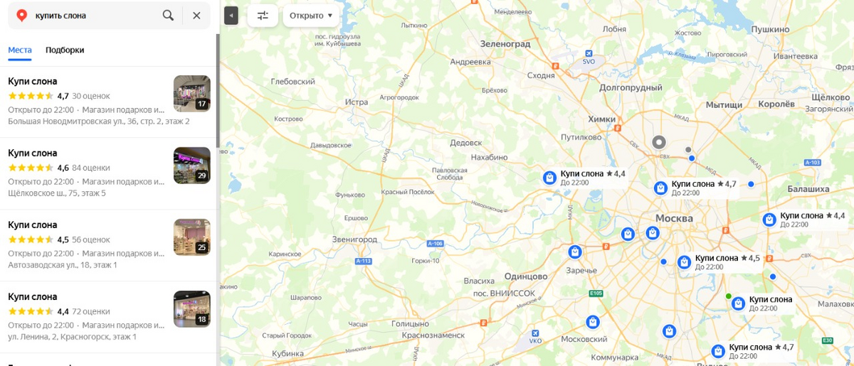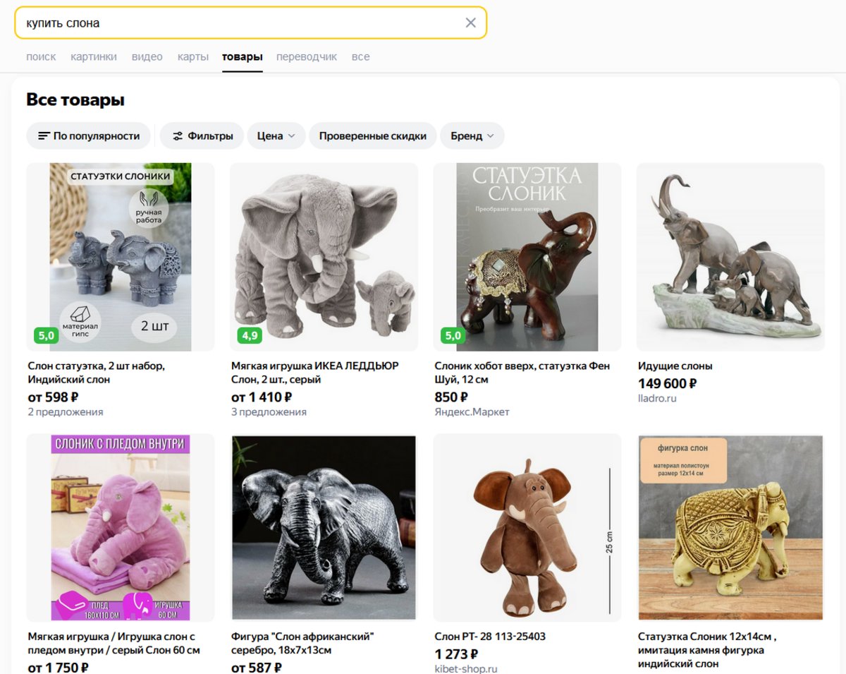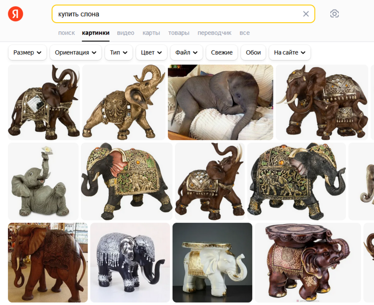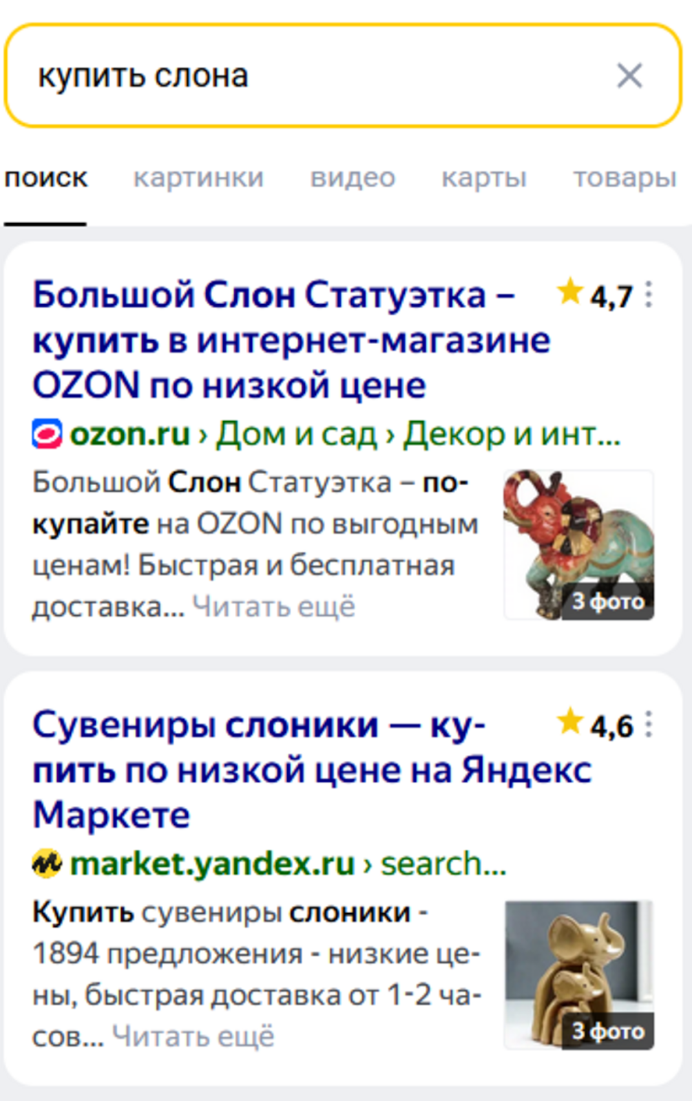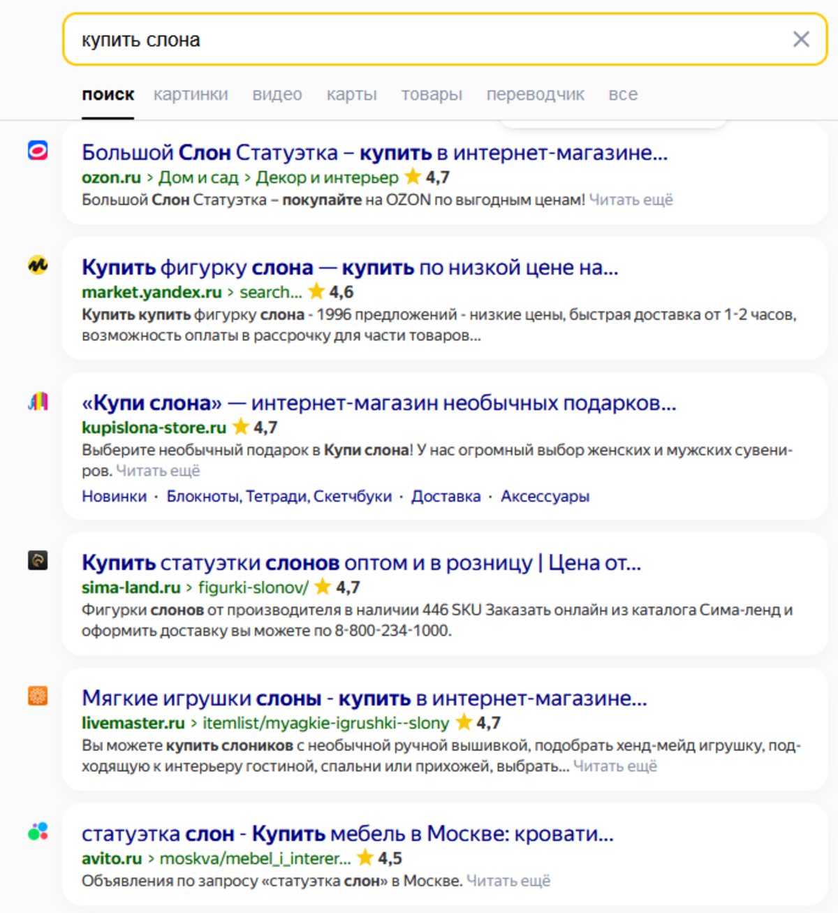 В ходе исследования мы выяснили, что 67% небрендового трафика поступает через основной поиск. Мобильный поиск тоже занимает значительную долю — 30%. При этом поиск через мобильное приложение занимает совсем небольшую долю 2%. Если в небрендовом трафике десктопный поиск превалирует над мобильным, то в брендовом он делится почти поровну между ПК и смартфоном (51% против 48%). Еще 1% остается на поиск через мобильное приложение. В Яндексе почти весь трафик генерируется через два ключевых канала — основной и мобильный поиск. Поиск товара обычно начинается с запроса «купить...». На примере известной детской шутки «а ты купи слона!» рассмотрим, как ранжируются сайты в десктопном и мобильном поиске. В ТОПе нерекламной выдачи — оптимизированные карточки товаров на маркетплейсах. Чтобы попасть в ТОП-10 по небрендовым запросам, компании необходимо активно заниматься SEO-продвижением. Для брендовых запросов важно, чтобы в ТОП-10 отображались только страницы с положительной тональностью — здесь ключевую роль играет SERM (управление репутацией в поисковых системах). Поиск привлекает больше всего трафика. Но картина меняется, когда дело доходит до конверсий. Для исследуемых интернет-магазинов поиск по товарам оказался самым эффективным в плане конверсий — они в два раза выше, чем из десктопного поиска. Углубившись в результаты исследования, видим еще более впечатляющие результаты. Например, для интернет-магазинов автомобильной тематики конверсия через Яндекс Товары достигает 5,32%, что значительно выше, чем через основной (1,45%) и мобильный (1,30%) поиск. Подобная ситуация наблюдается и в других категориях, таких как обувь и косметика, где конверсии достигают 4-5%. Исключением стала категория одежды — здесь конверсия из Яндекс Товаров существенно ниже конверсии из других каналов. Это может быть связано с особенностями выбора, при котором пользователи предпочитают более глубокое изучение ассортимента. Результат исследования объясняется спецификой Яндекс Товаров. В отличие от обычного поиска, этот сервис предоставляет в выдаче подробную информацию о товаре: фотографии, цены, основные характеристики. Это упрощает процесс выбора и покупки, что и приводит к высоким конверсиям. А теперь вернемся к нашим слонам. Вот так выглядит поиск по Яндекс Товарам. Вернемся к графику средних показателей конверсии по нашей выборке. Еще один неожиданный вывод исследования касается Яндекс Картинок. Этот канал, несмотря на скромные объемы трафика, показывает хорошие результаты по конверсиям — они выше, чем из мобильного поиска. Оптимизация изображений для поиска в Яндекс Картинках — это небольшая инвестиция времени, которая может принести ощутимый результат. Для категорий товаров, где визуальная составляющая играет ключевую роль (мода, интерьер, косметика и т.д.), этот канал может стать дополнительным источником заказов. Конверсии из поиска по товарам почти в три раза превышают конверсии из мобильного приложения Яндекса. При этом для продвижения в поиске по товарам достаточно сделать фид, а продвижение в мобильном приложении по трудозатратам сравнимо с продвижением в основном поиске и требует значительно больше времени и ресурсов. Исследование показало, что с Яндекс Карт в основном идет брендовый трафик, который слабо конвертируется в онлайн-заказы. Но это вовс