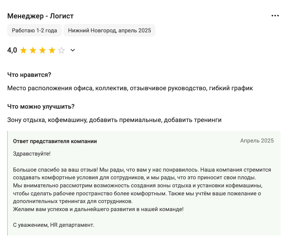 Кандидаты хотят знать, как компания ведет себя в конфликтных ситуациях и реагирует на ошибки, есть ли переработки, действительно ли выплачивается премия и как устроено общение с руководством. Все эти детали невозможно прописать в вакансии, но они регулярно всплывают в отзывах. Поэтому негатив, даже единичный, но яркий и оставшийся без официального ответа, может перекрыть все рекламные усилия.