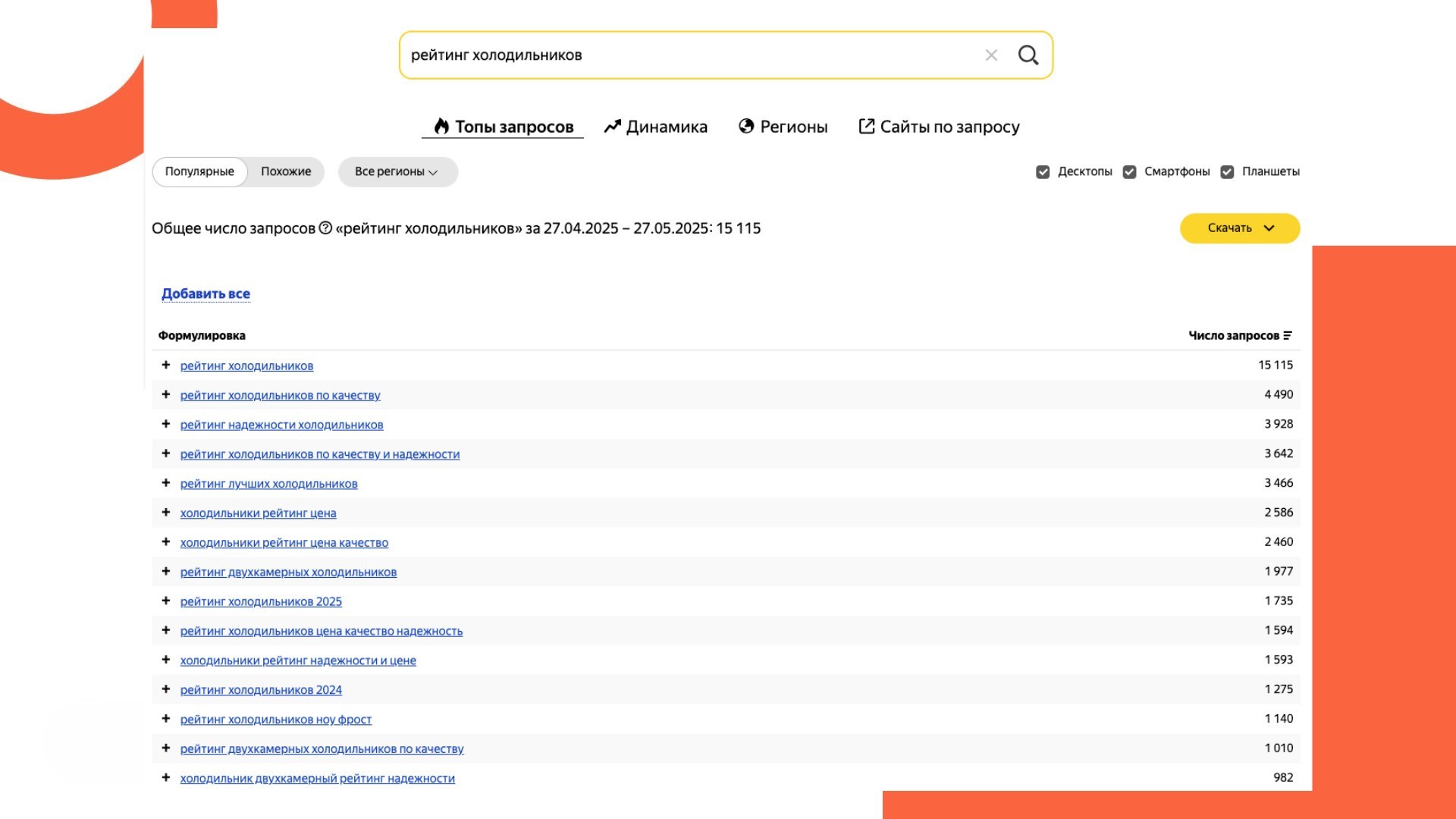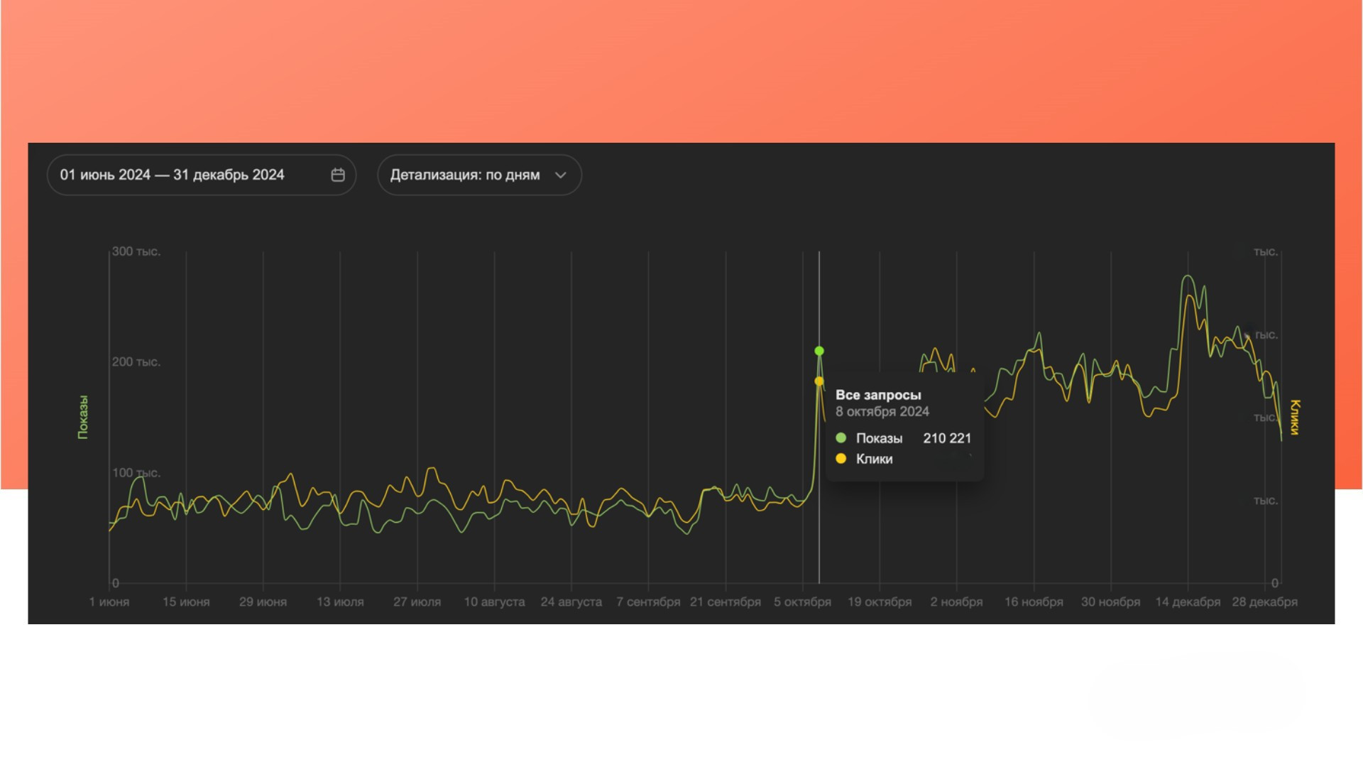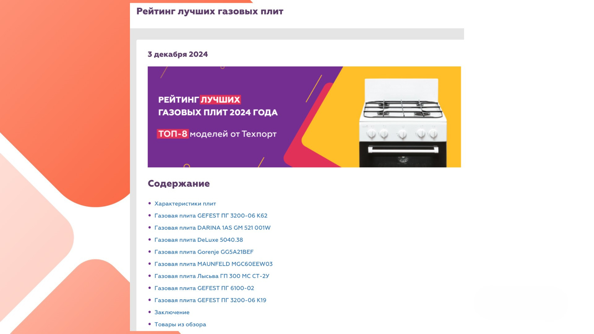 Из-за обширного меню в текст каждой страницы попадали лишние слова. Например, облако слов для листинга «микроволновые печи» сдвинуто далеко от целевого запроса: У нас появилась гипотеза: если выключить рендеринг в Яндексе, то это может положительно сказаться на текстовой релевантности всех страниц, так как в меню вложено большое количество подразделов, а Яндекс восприимчив к текстовой релевантности. Итак, мы запретили рендеринг JS в Яндекс Вебмастере и получили сокращенную версию меню. Теперь версия ранжируемой страницы выглядит так: Для региональных страниц мы подготовили текстовый шаблон с переменными. Шаблон содержит упоминание топонима, адреса точки выдачи, наименование раздела и число активных товаров. Наш ассортимент в разделе [наименование категории] в Санкт-Петербурге представлен [число] товарами. Осуществляем быструю доставку по городу. Адрес пункта выдачи для самовывоза: СПб, Проспект Энергетиков, 3Б (ТК Ладожские ряды, 2 этаж, секция 76). Дополнительно в футере мы исправили описание под соответствующий город. Таким образом созданные когда-то страницы городов в подпапках получили дополнительные вхождения топонима, а также небольшие фрагменты, которые уникализируют страницы относительно друг друга. Сегодня поисковая выдача забита всевозможными рейтингами и обзорами товаров. Их публикуют самые разные сайты — даже те, которые вообще не связаны с продажами. Они просто делают подборки и отправляют людей по партнерским ссылкам. А в чем преимущество настоящего интернет-магазина? Он может продвигать собственные товары, которые действительно хорошо продаются. Плюс — сайт сам по себе тематически подходит под такие страницы, что помогает им лучше ранжироваться в поиске. Проверив спрос, мы убедились, что создание страниц рейтингов точно имеет смысл. Для рейтингов мы подготовили новый шаблон страниц и контент. Спустя 2 недели после отключения рендеринга видимость сайта в Яндексе резко выросла. Соответственно, увеличился и трафик. Видимость сайта выросла на 200%. Количество кликов (трафик) — на 175%. В результате оптимизации региональных страниц выросла средняя позиция при аналогичном объеме заказов и количество кликов (трафик) в подпапках. Обзоры в рейтингах были опубликованы в декабре 2024 года и со временем показали хороший результат в Google. Пиковое значение: 1000+ показов в сутки. Страницы обзоров вышли в ТОП по популярным запросам. В результате комплексной SEO-оптимизации онлайн-гипермаркет Techport попал в ТОП-10 большого числа запросов на максимально широкой выборке. Количество запросов в ТОП-10 выросло в 2 раза, а в ТОП-5 и ТОП-3 — в 3,5 раза. 1. Обращайте внимание на реализацию сквозных элементов. Иногда простое решение значительно улучшает видимость сайта. 2. Если на сайте уже реализованы подпапки по городам, то оцените их текущую видимость и спрос по данному гео. А потом проработайте текстовую релевантность под нужное гео. 3. Запросы под рейтинги, подборки, обзоры становятся все популярнее, и интернет-магазинам стоит создавать свои тематические «ТОПы». Индивидуальная стратегия SEO-продвижения помогла повысить видимость онлайн-гипермаркета Techport в поисковых системах и привела к значительному росту органического трафика.