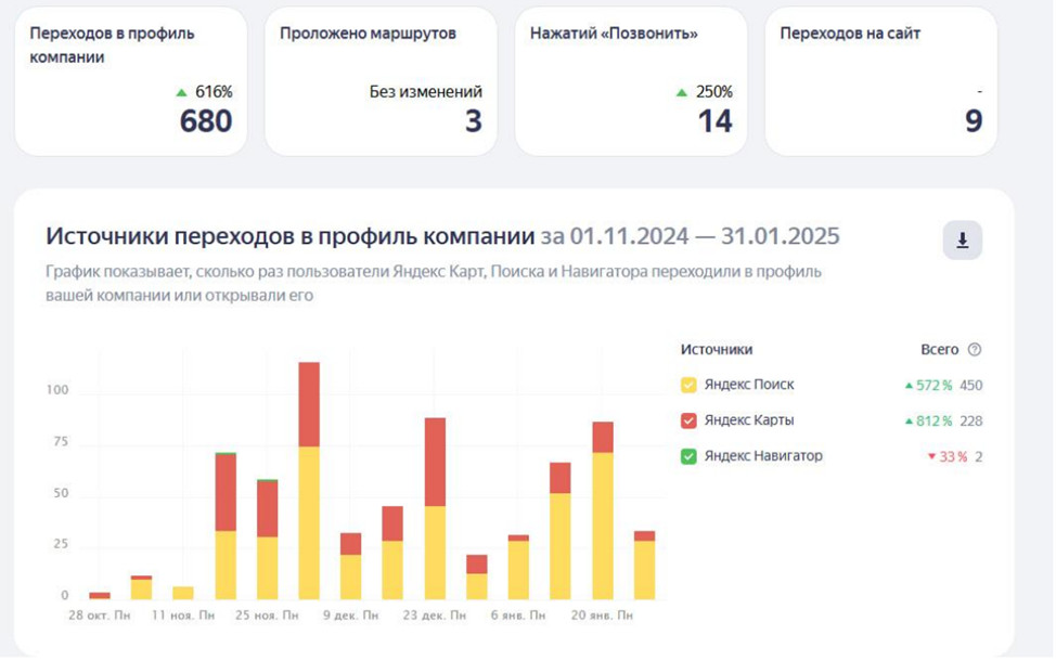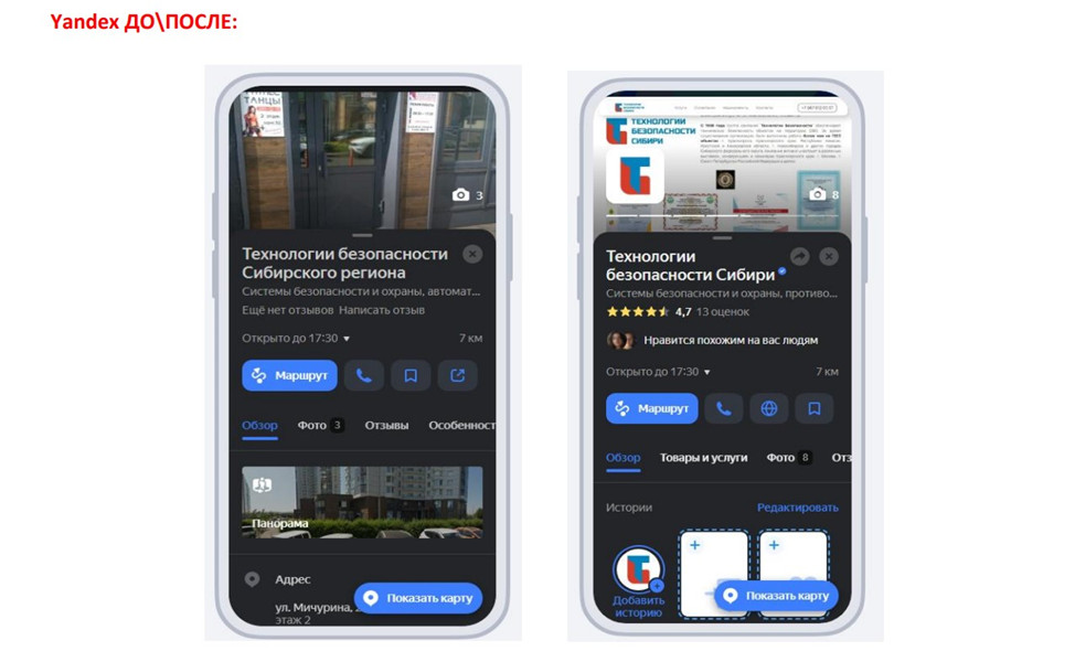 в Яндекс.Картах с 32 до 230 переходов в месяц. Также увеличились звонки. ДО ПОСЛЕ Мы